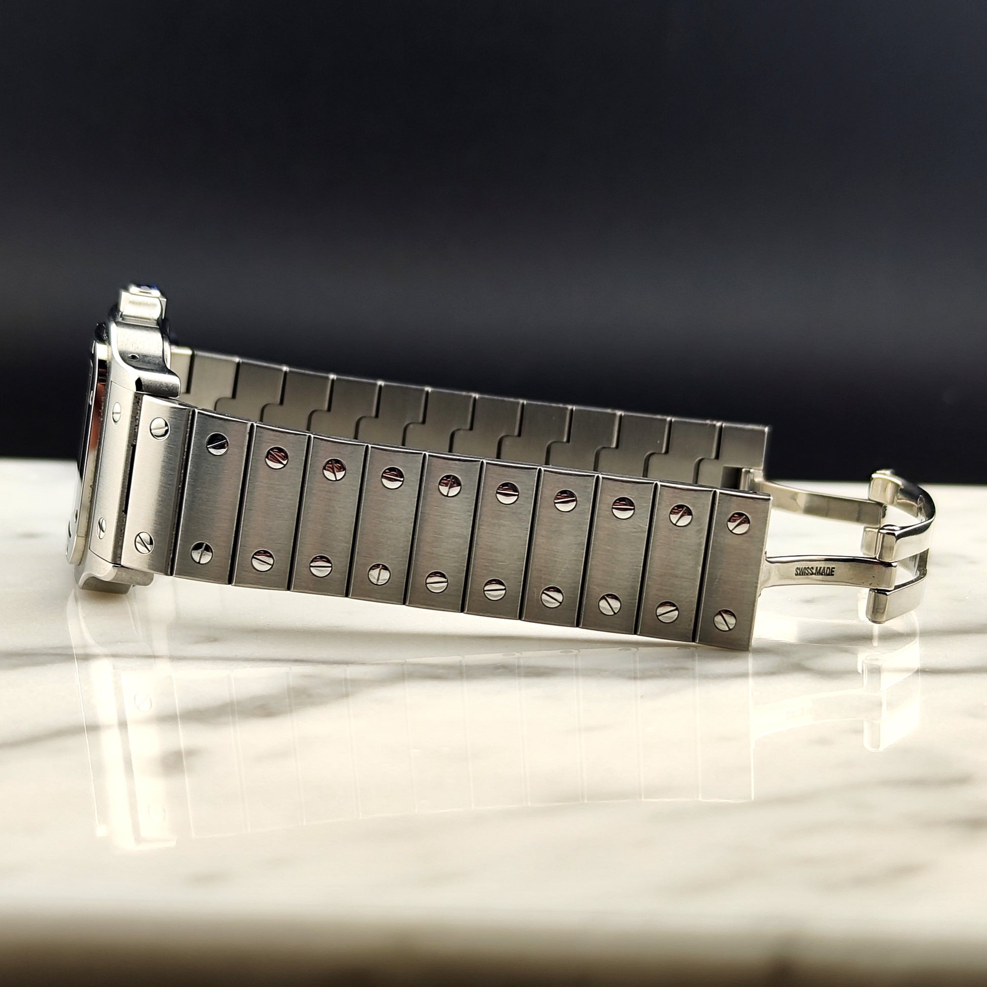 We are pleased to offer an exceptional Cartier Santos Galbée 32mm from 2010—a truly outstanding example in near-mint condition. This watch comes as an extensive full set and was professionally serviced by us in December 2025. The full set includes: • Original first purchase invoice from Wempe (2010) • Two additional bracelet links (complete bracelet, all links present) • Wempe papers and Wempe warranty card • Original Cartier papers and certificate • Original instruction manual including the rare DVD • Original Cartier box with outer box The only missing item is the small cushion inside the watch box. The watch was stored in a safe for nearly 15 years and shows virtually no signs of wear. The bracelet has almost no stretch at all, which clearly reflects its exceptional condition. Without exaggeration, this is one of the finest Cartier Santos Galbée examples currently available worldwide. Don’t miss this opportunity.