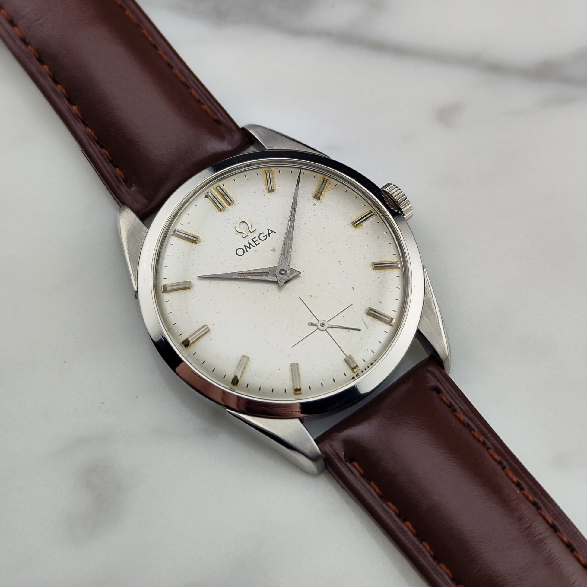 The Omega Classic White Dial was serviced by us in January 2026 [Ref. 2900-7]. A wonderful, historically significant timepiece from 1958 — nearly 70 years old and in good condition. Don’t miss this opportunity.