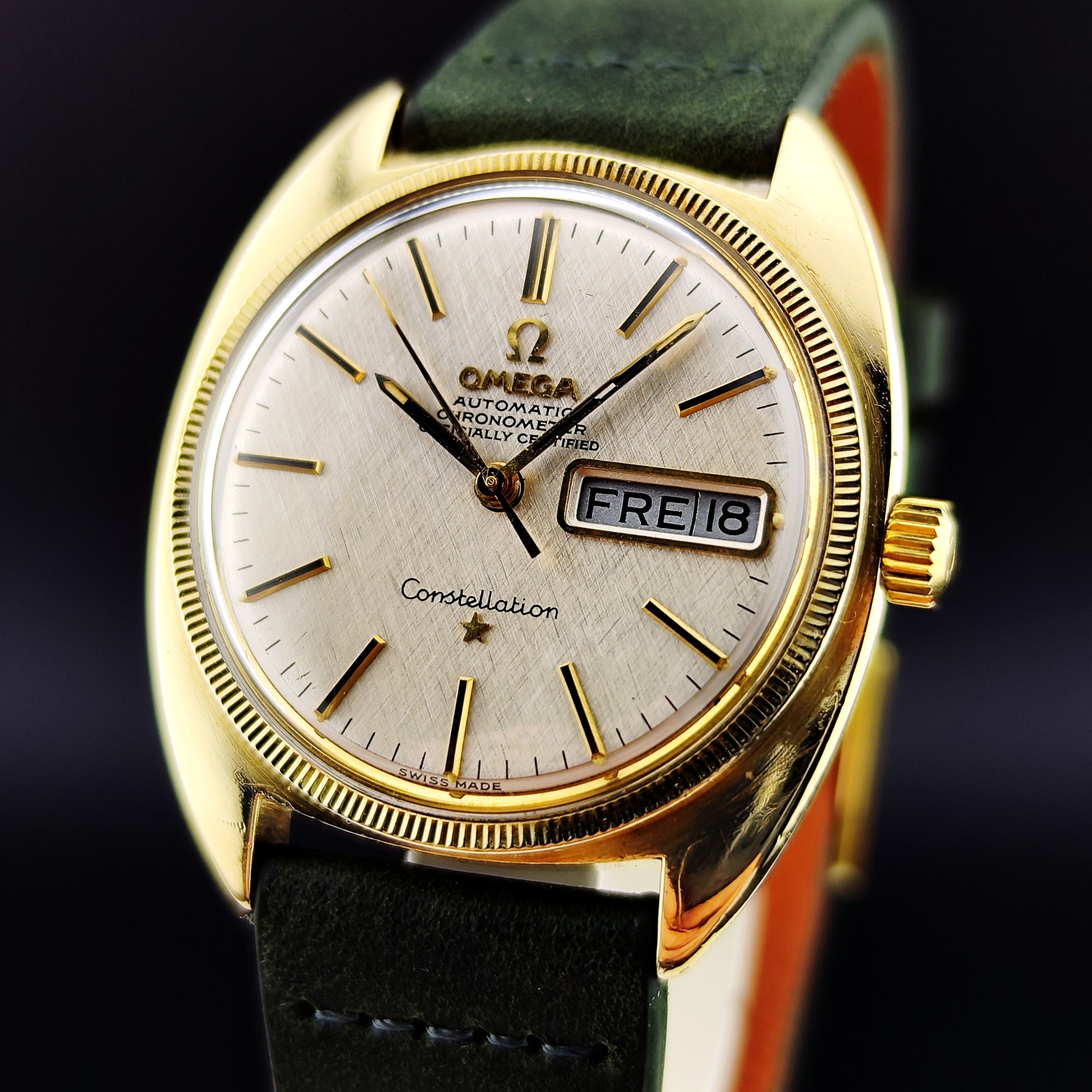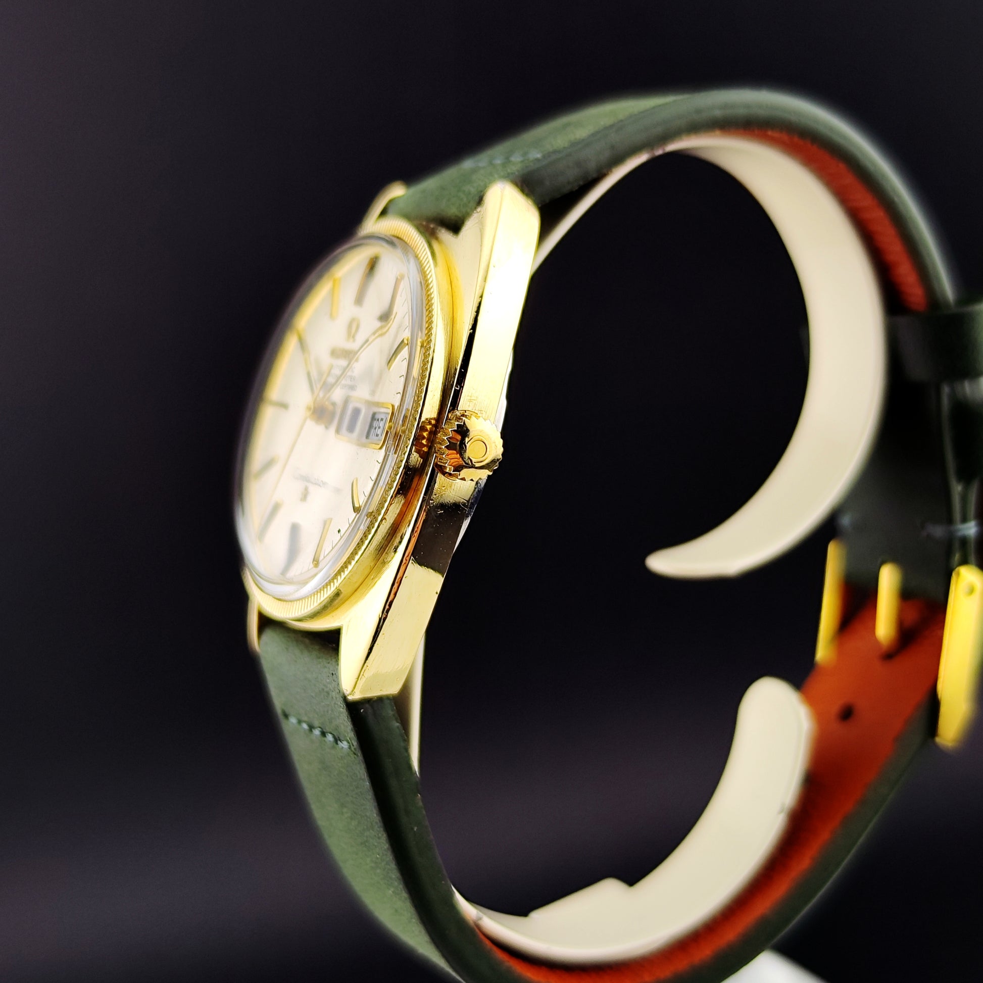 An absolutely fantastic watch: the Omega Constellation C-Shape in gold with the German Day-Date disk (Ref. 168.029). A true beauty, fitted with an original Omega clasp, a wonderful green leather strap, and excellent timekeeping performance. A fantastic option—best to act quickly, as this watch is rarely available online in such outstanding condition.
