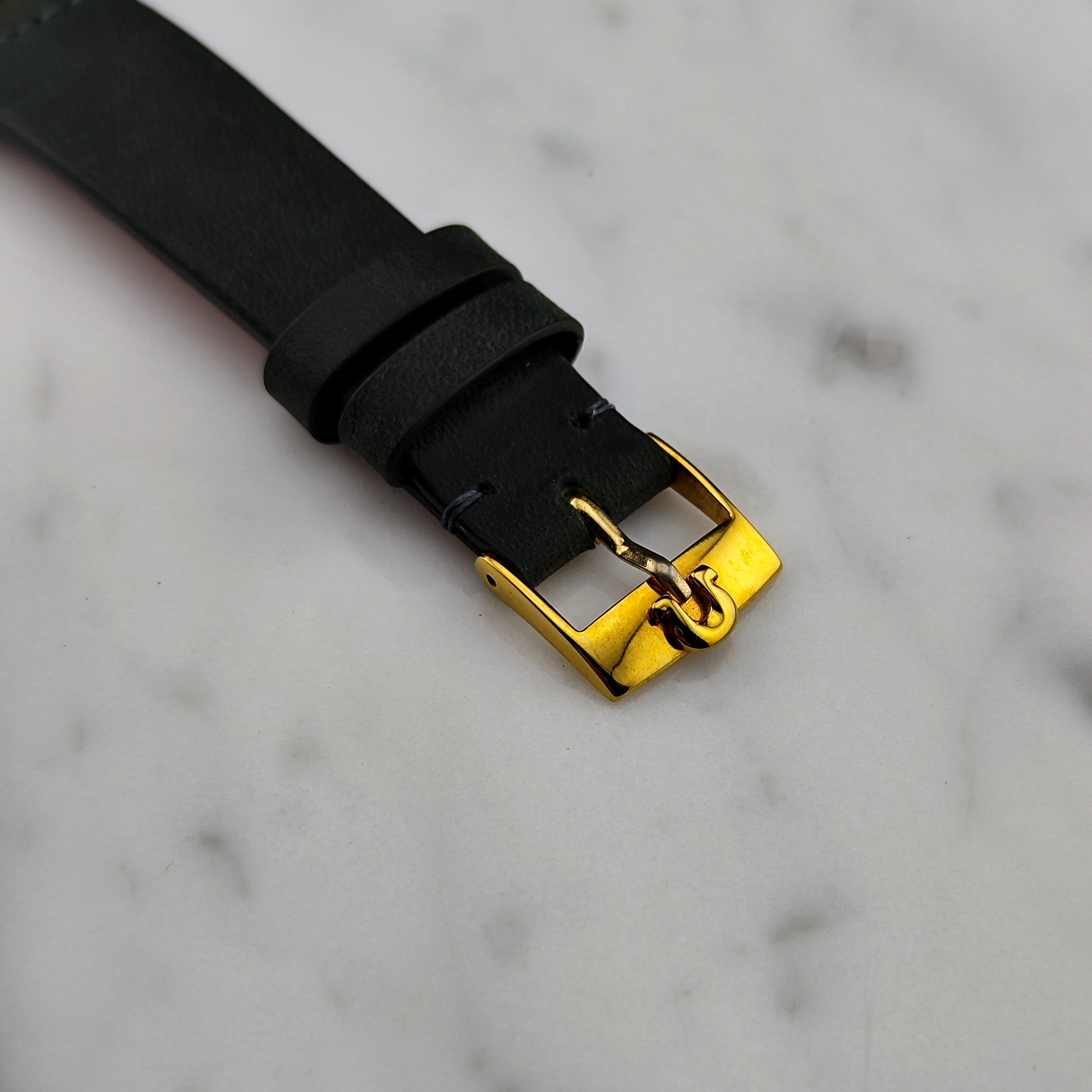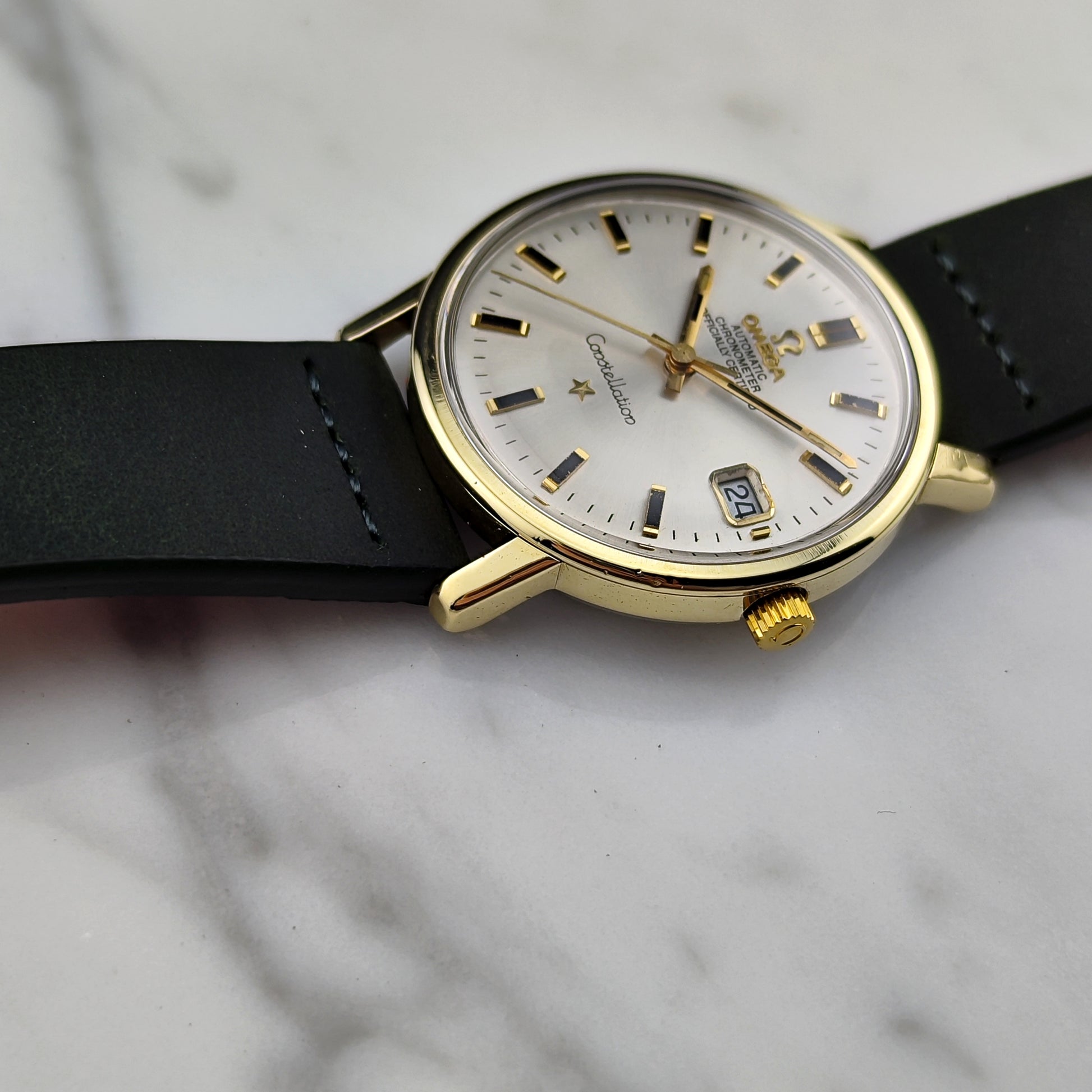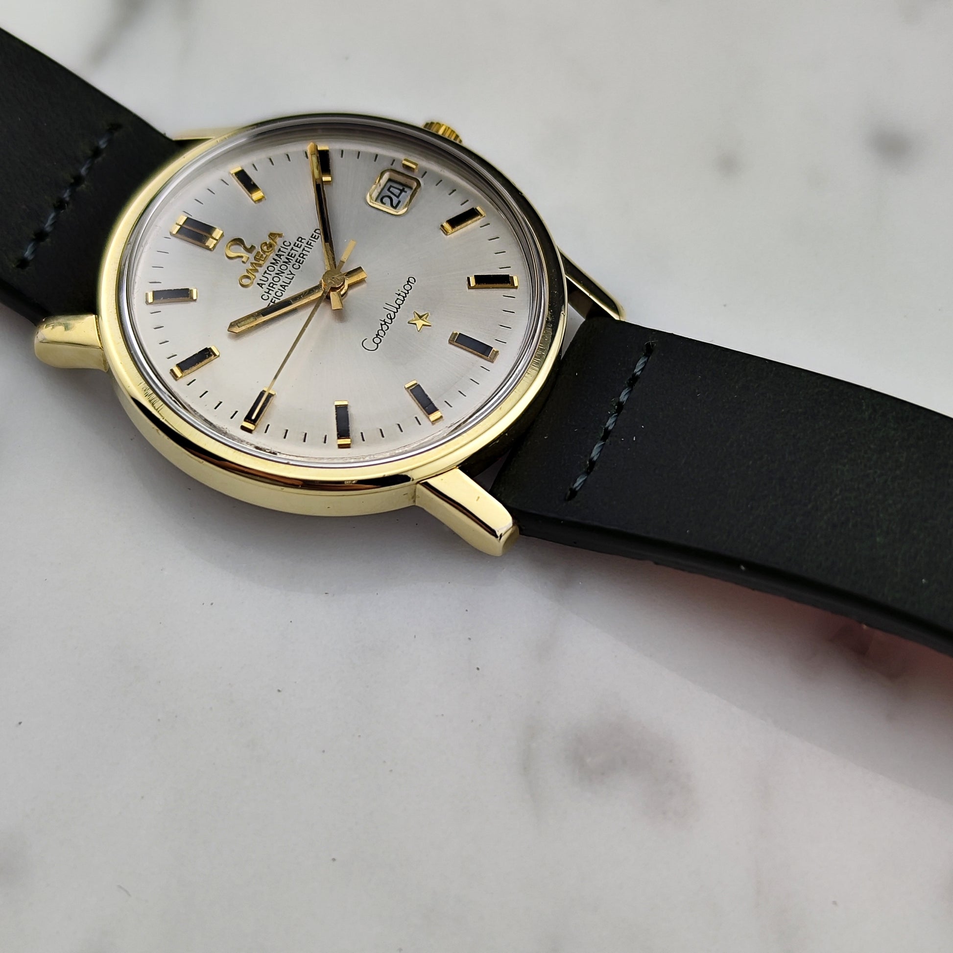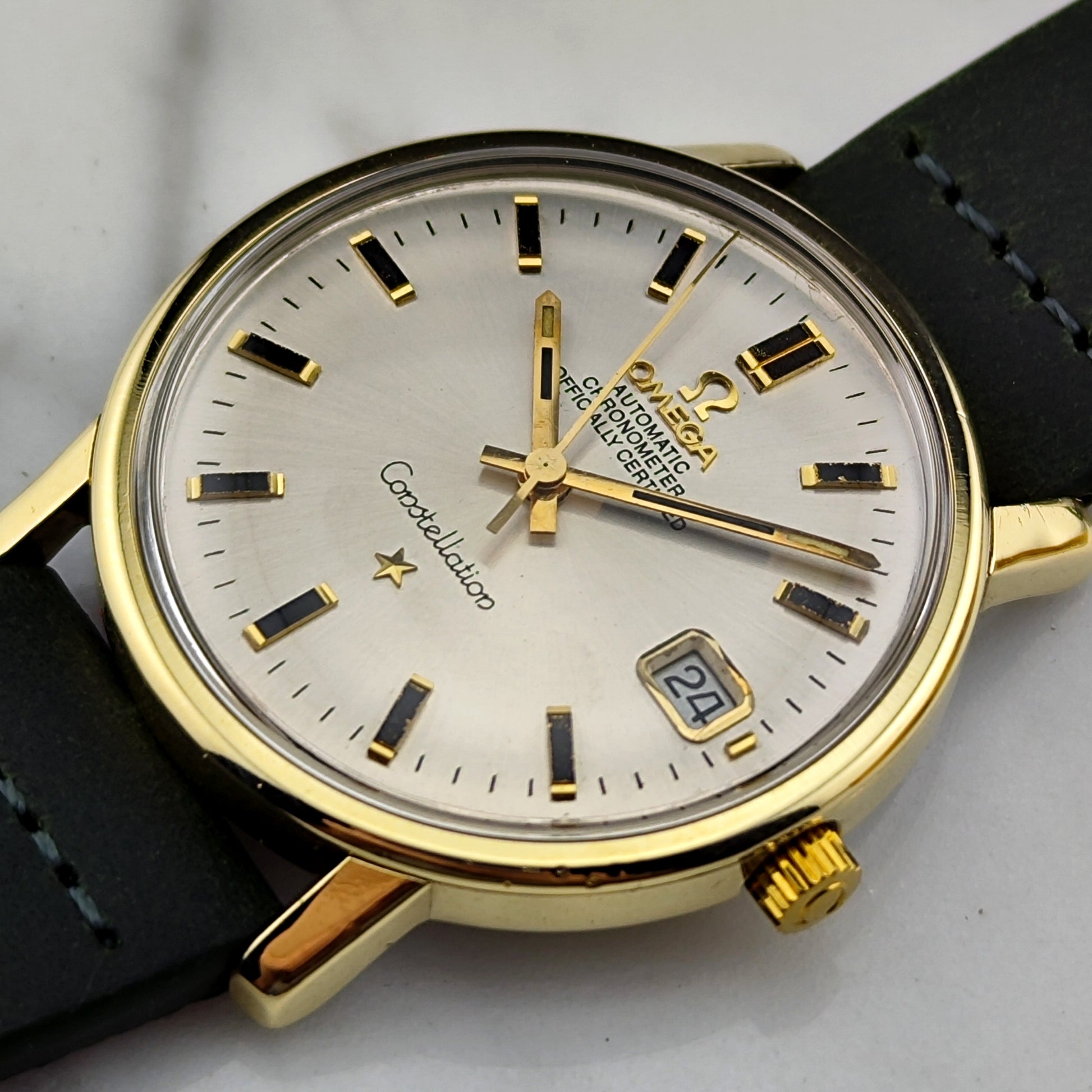 The Omega Constellation Chronometer Gold from 1968 [REF. 168.018]. The movement has been tested and the timekeeping verified. The dial is a reprint but well-made. An interesting watch with a green leather strap, available at a great price.