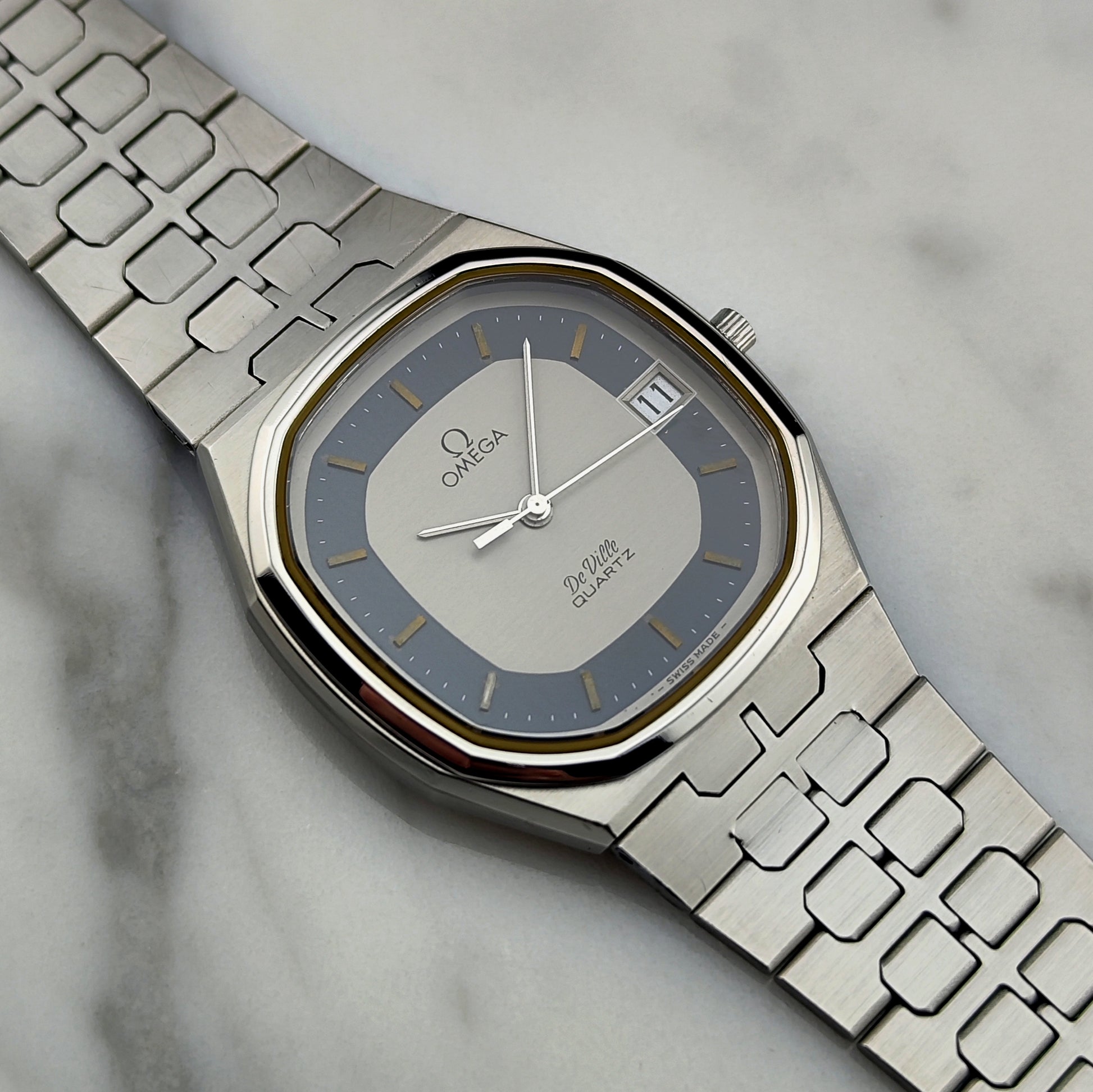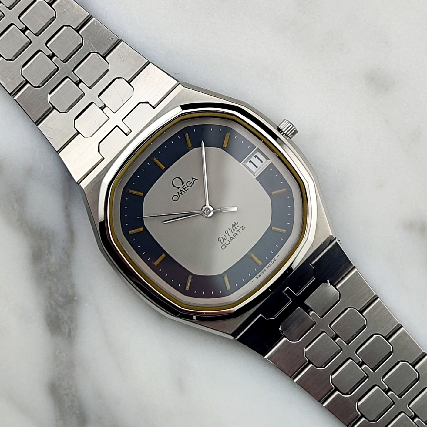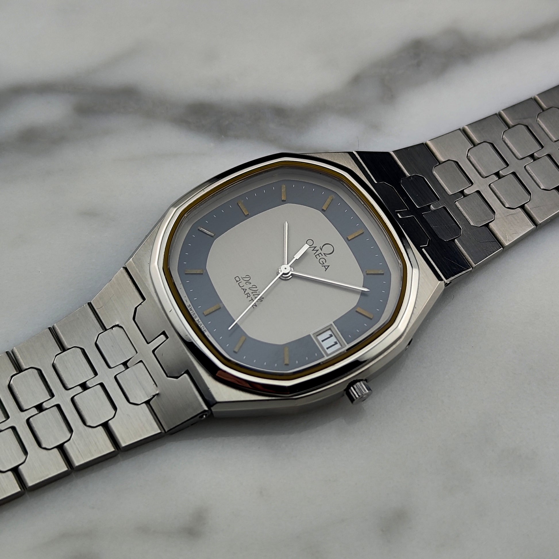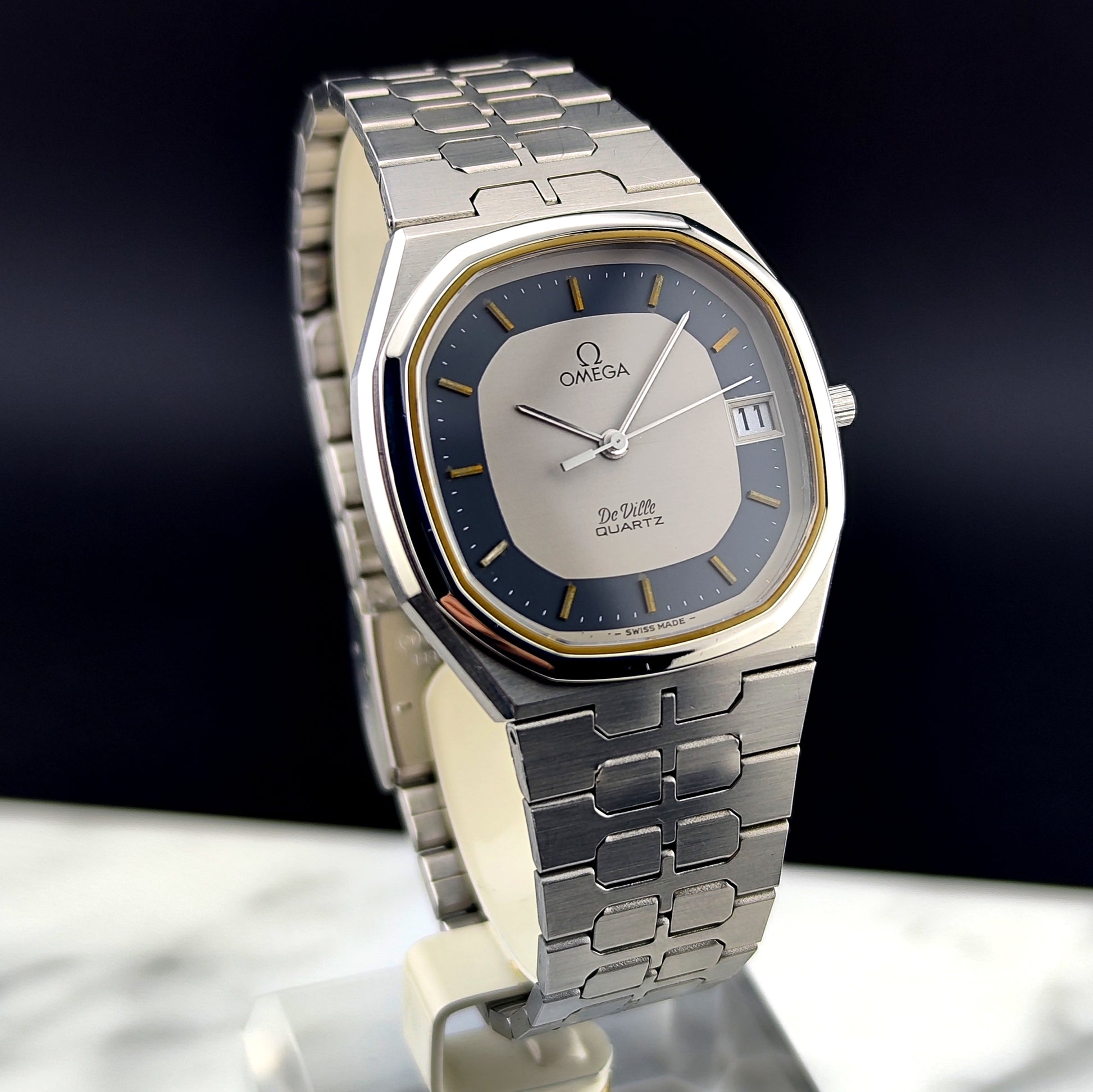 The Omega De Ville Date Quartz with rare blue ring dial [Ref. 196.0145] is a wonderful watch and very hard to find. The dial and the overall case are in excellent condition. The bracelet shows no stretch and is also in very good condition. The movement has been tested and inspected.