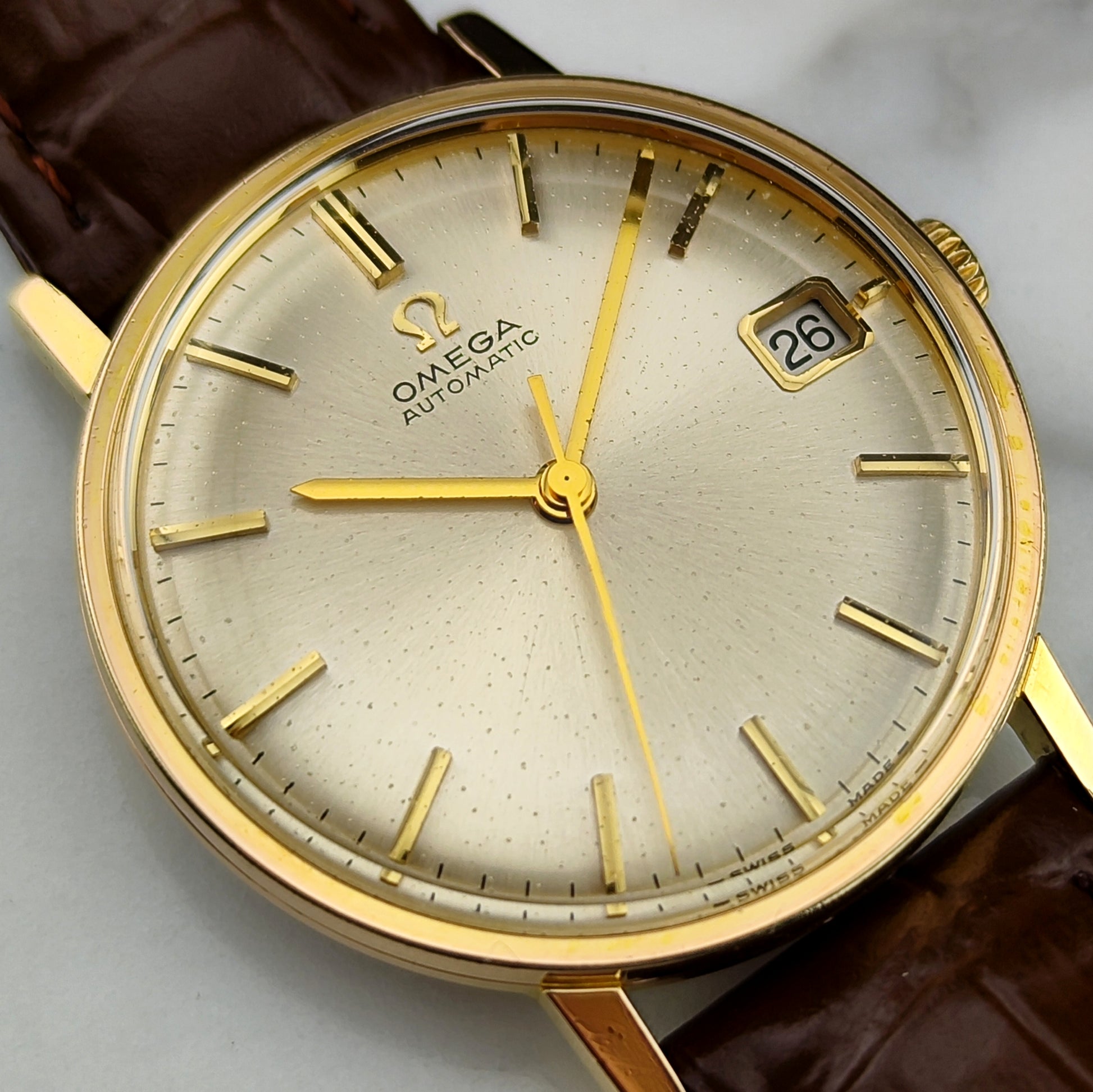 The Omega Genève Automatic Gold White Dial [Ref. 162.009] is a beautiful watch with a light but even patina. Overall, the watch is in good condition, and the movement has been tested and inspected.