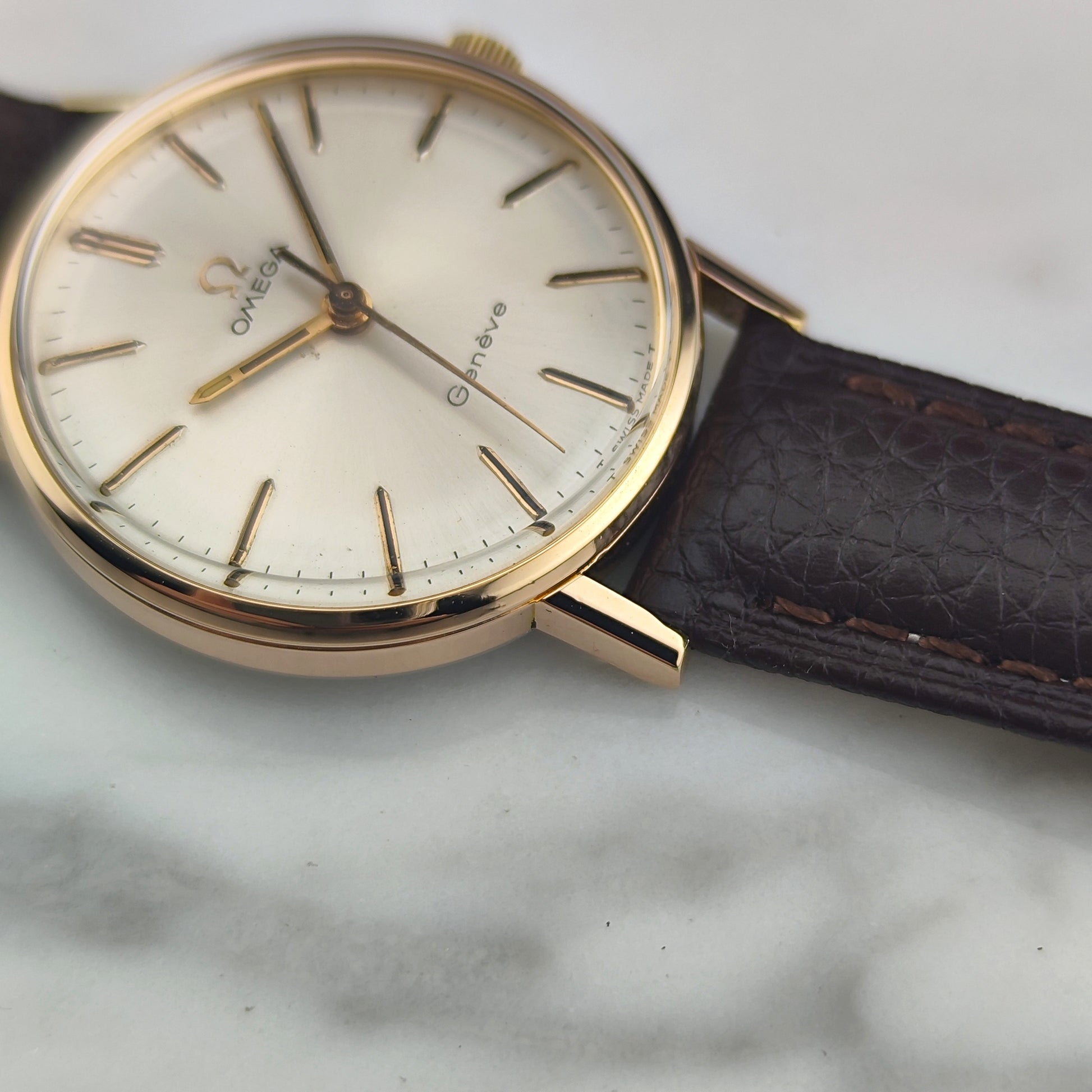 The Omega Genève Gold with white dial from 1968 [Ref. 131.018]. A wonderful timepiece; the movement has been inspected and tested.