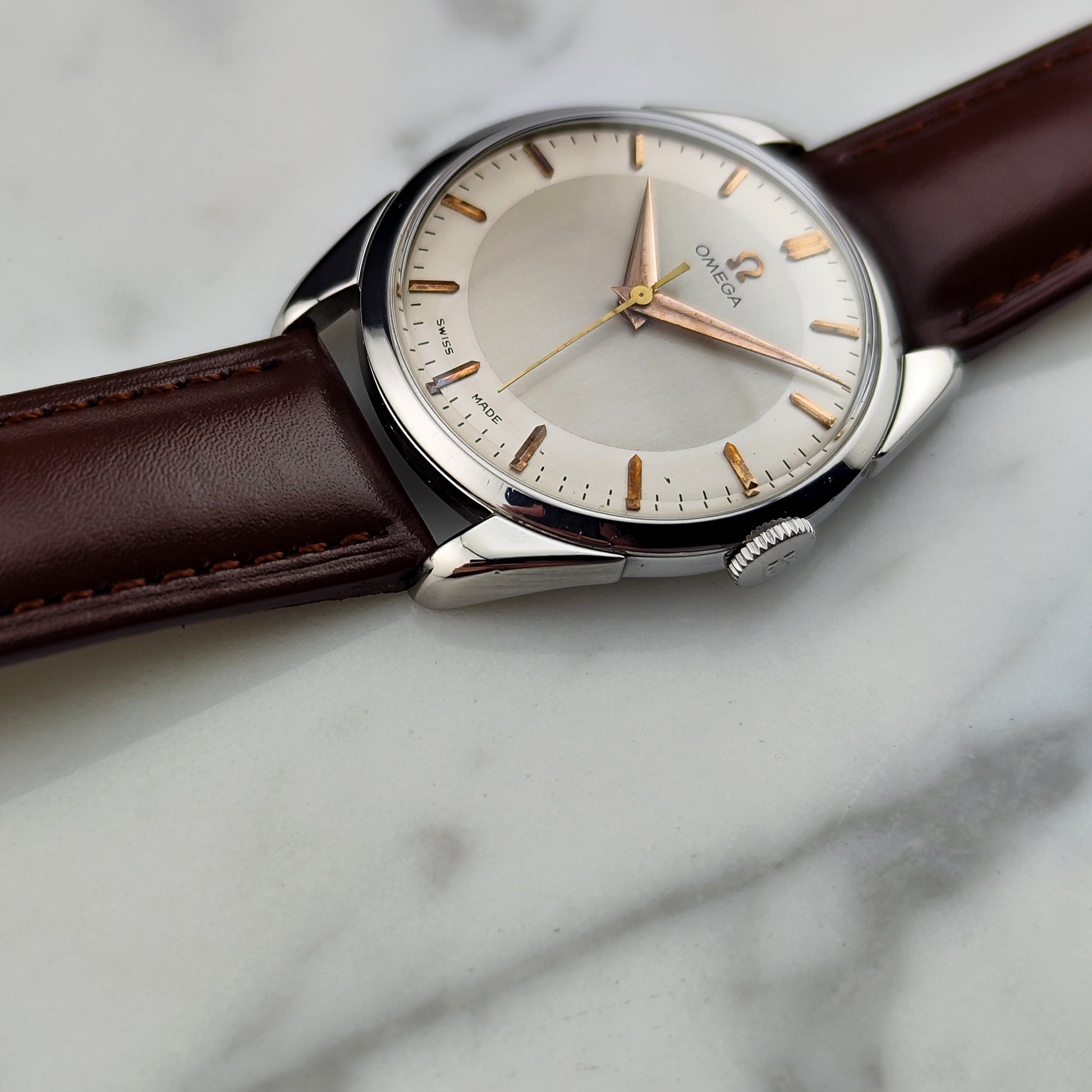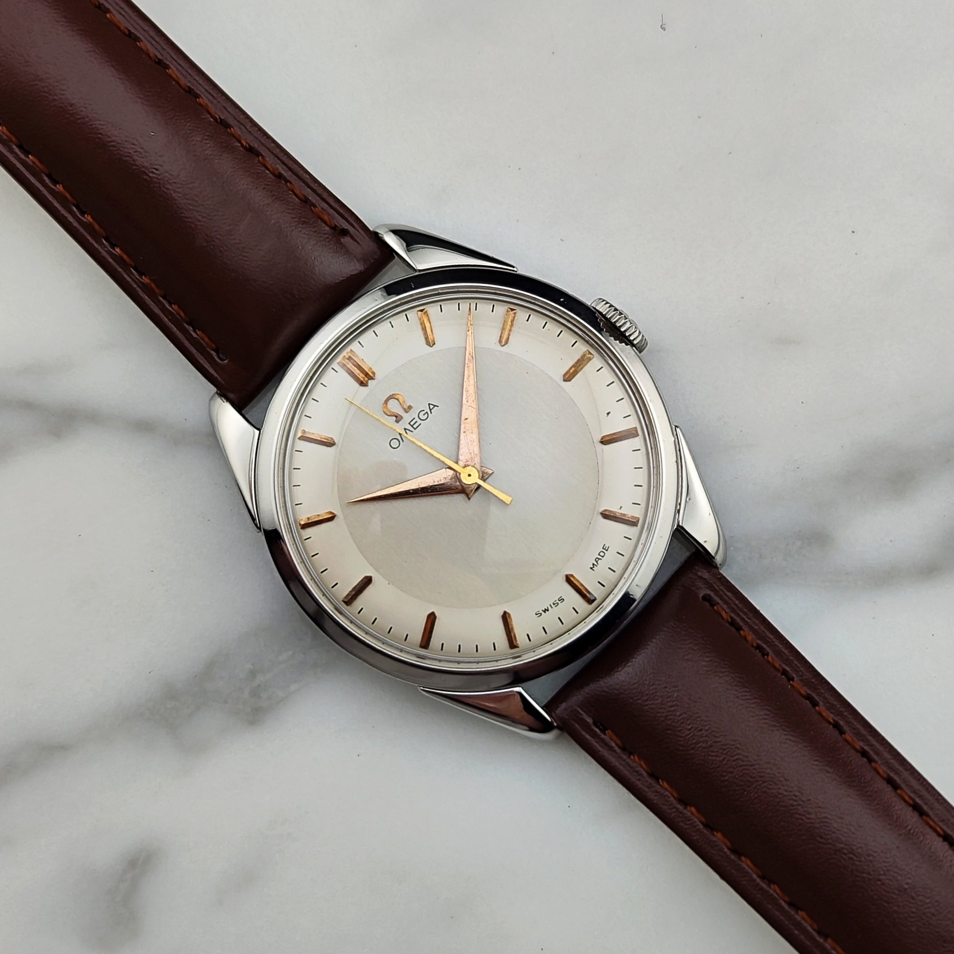Omega Genève – White Dial, 1956 (Ref. 2910-1) This remarkable timepiece is now an incredible 70 years old and continues to run beautifully. The movement has been thoroughly tested and inspected to ensure reliable performance. A true testament to Omega’s craftsmanship and longevity.