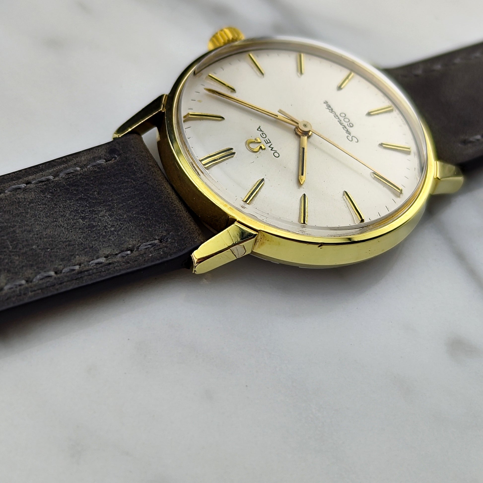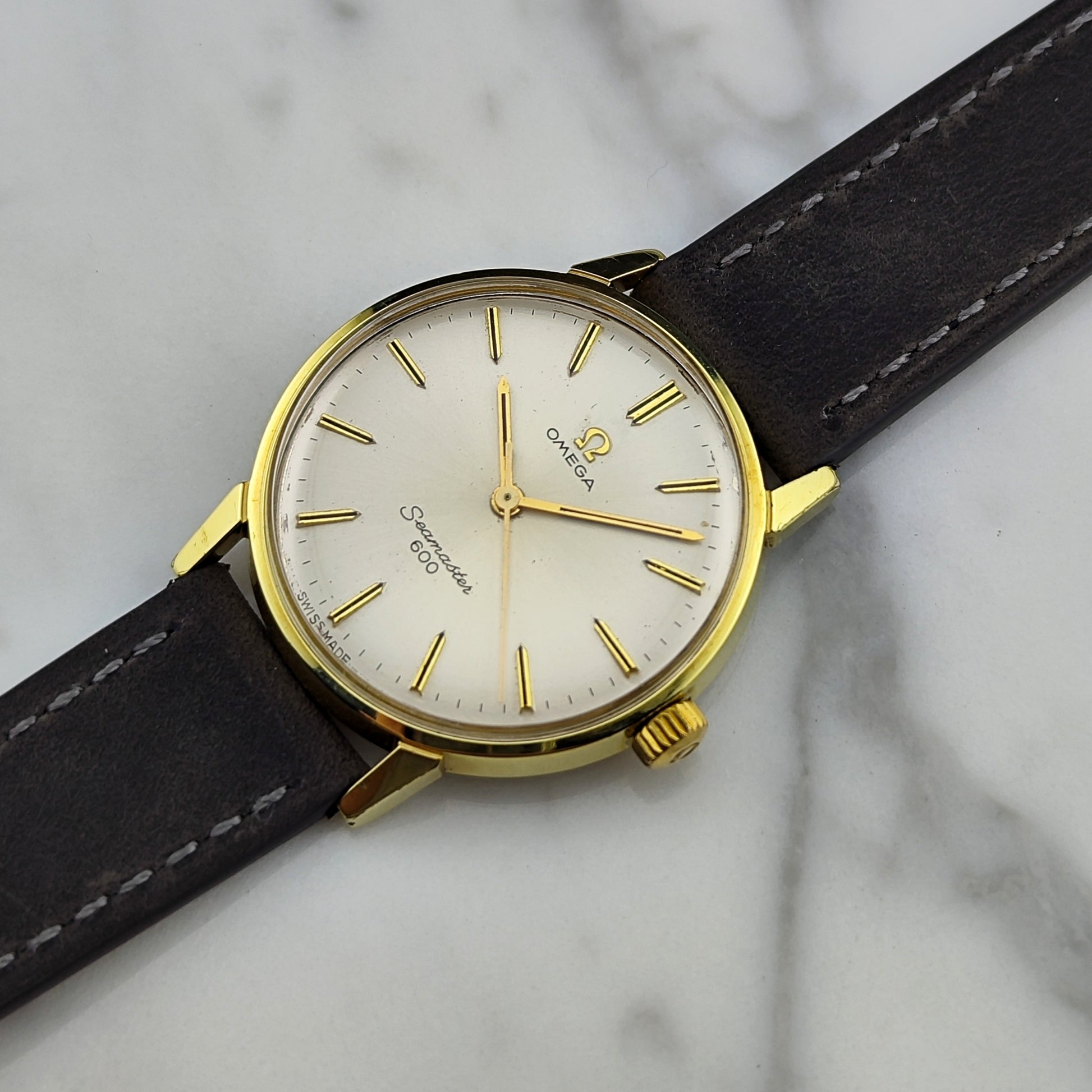 The Omega Seamaster 600 in gold with a white dial [Ref. 135.011]. The 600 series Omegas are very rare, and this is an excellent option for you. The watch is equipped with strong timekeeping performance, the movement has been tested and fully inspected.