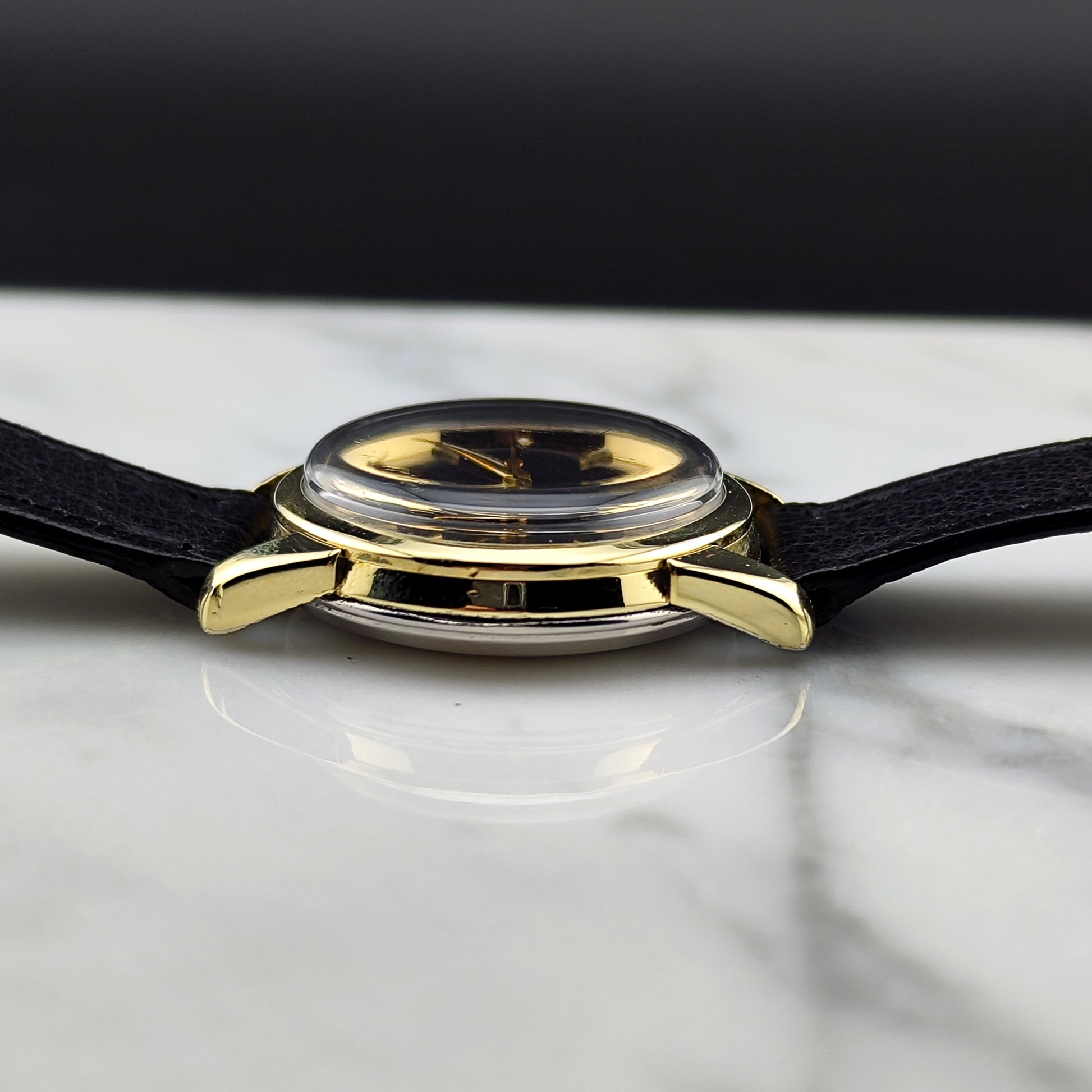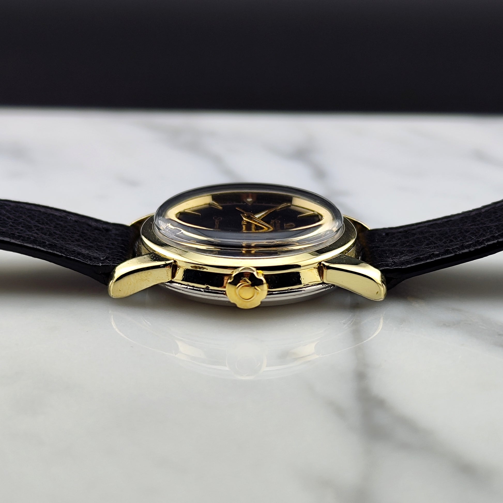 The Omega Seamaster Automatic Black Dial All Original [REF. 2826], has received a fresh service from us and runs very well. EVERYTHING on this watch is in original condition, even the leather strap is still in excellent shape. A true dream for collectors. This watch can be worn by men with thinner wrists but is primarily intended for ladies. Perfection.