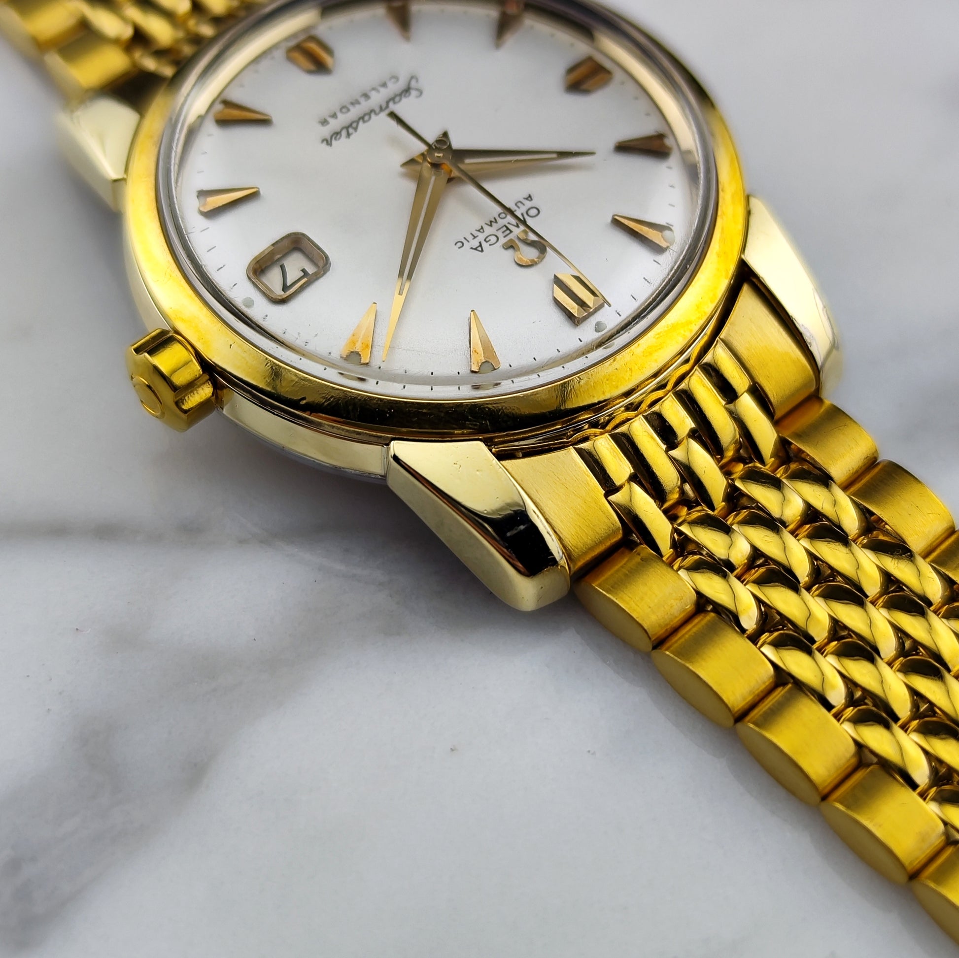 OMEGA Seamaster Calendar Gold White Dial Super Rare Signed Crystal [REF. 2849]