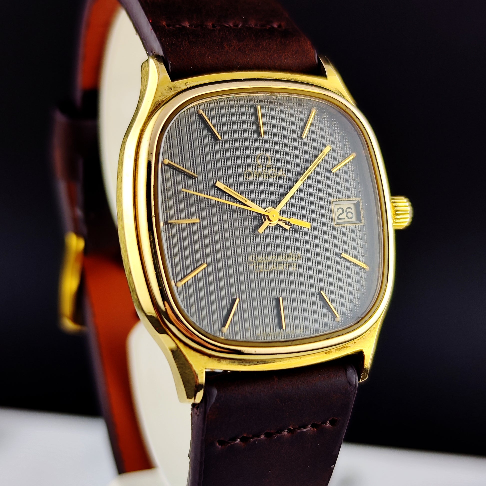 This Omega Seamaster Gold with Black Tapestry Dial from 1978 [REF. 196.0191] is incredibly rare. We are currently the only ones worldwide offering this model, so don’t miss this opportunity. The movement has been tested and checked. The watch is beautiful and rare. The crystal has a few very minor scratches, as can be seen in the pictures.