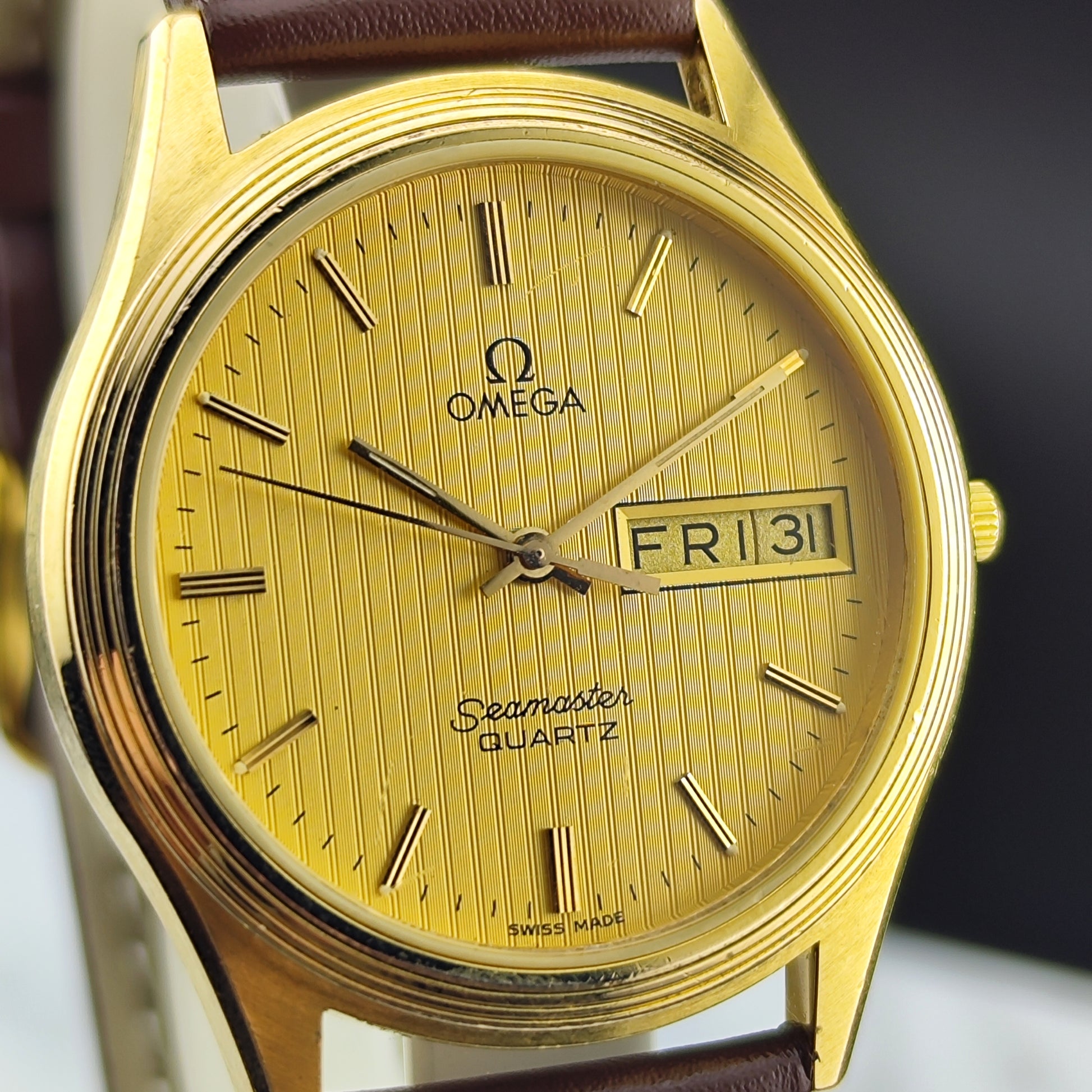 A wonderful option for you: the Omega Seamaster in gold with the rare tapestry dial and day-date function. This watch is extremely rare and truly special. It offers both German and English day displays, allowing you to choose whichever you prefer. The watch is in good condition, and the movement as well as all functions have been tested and are working perfectly!