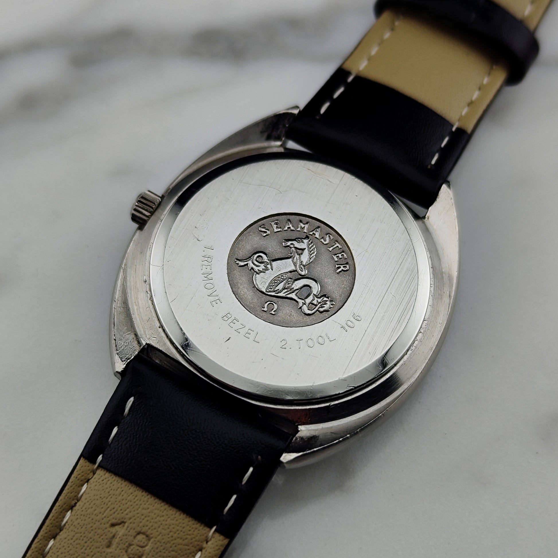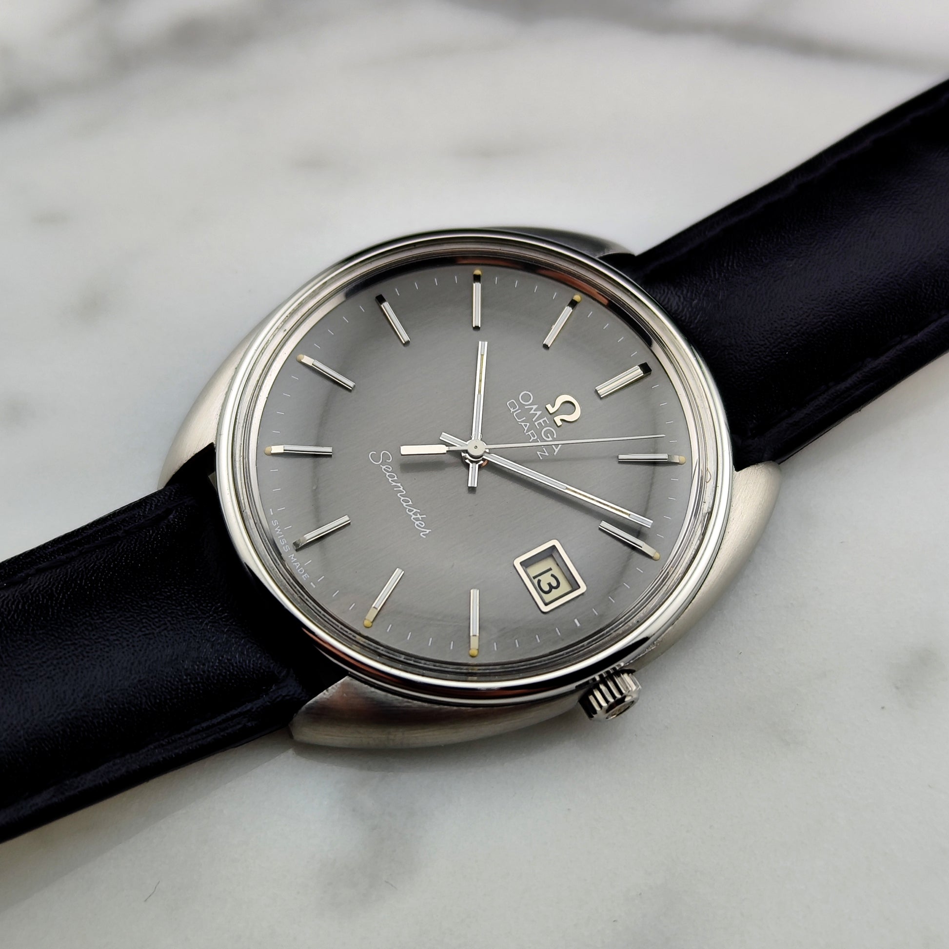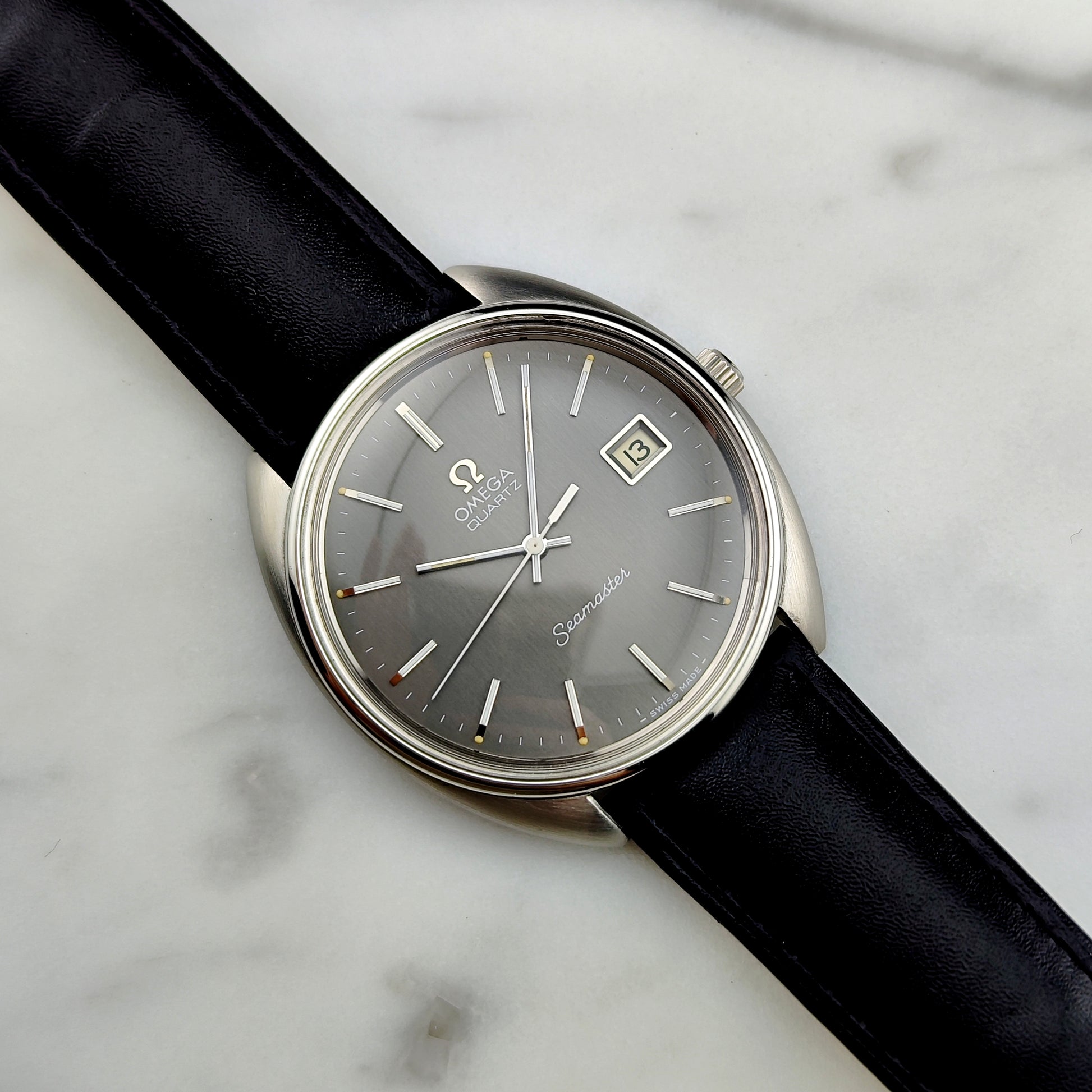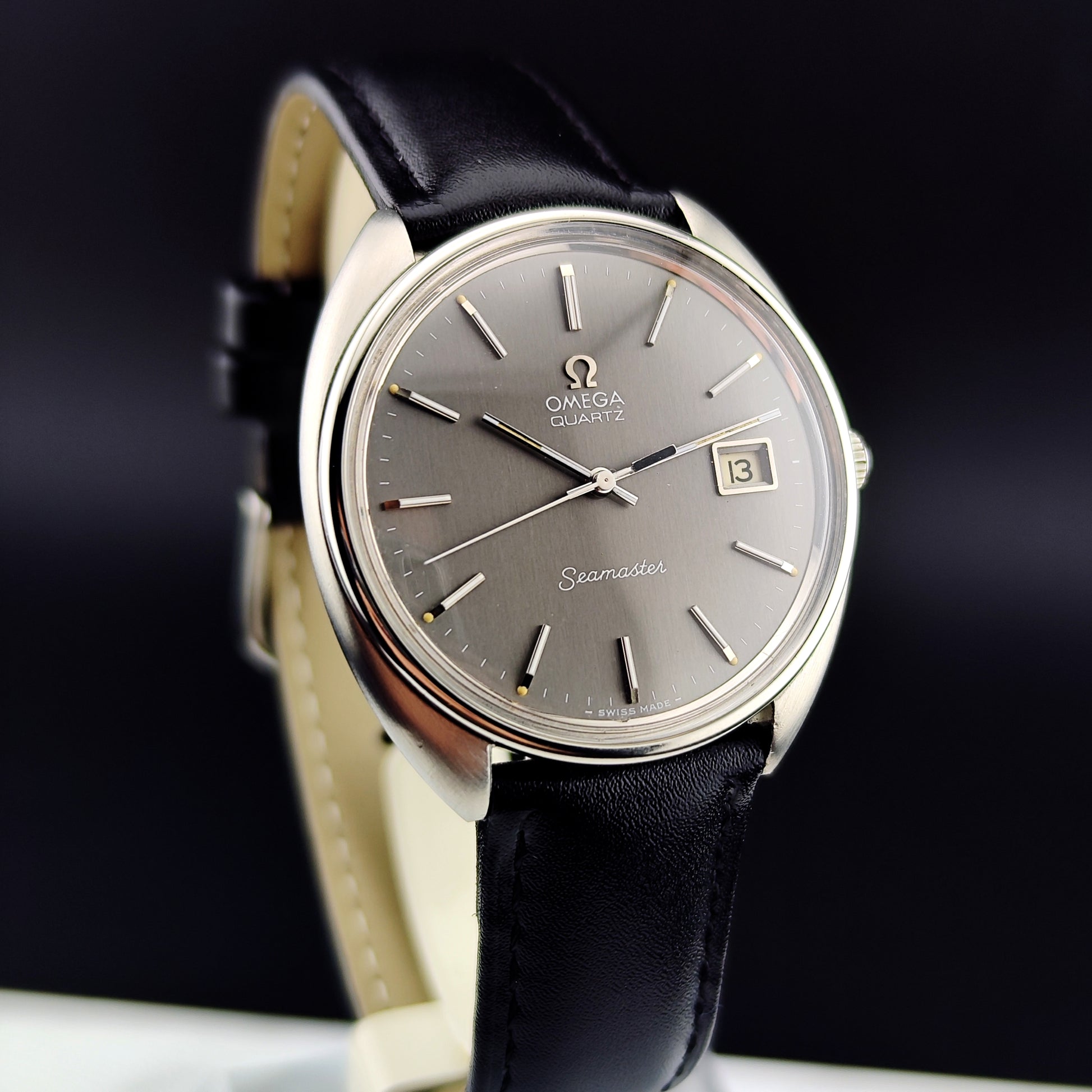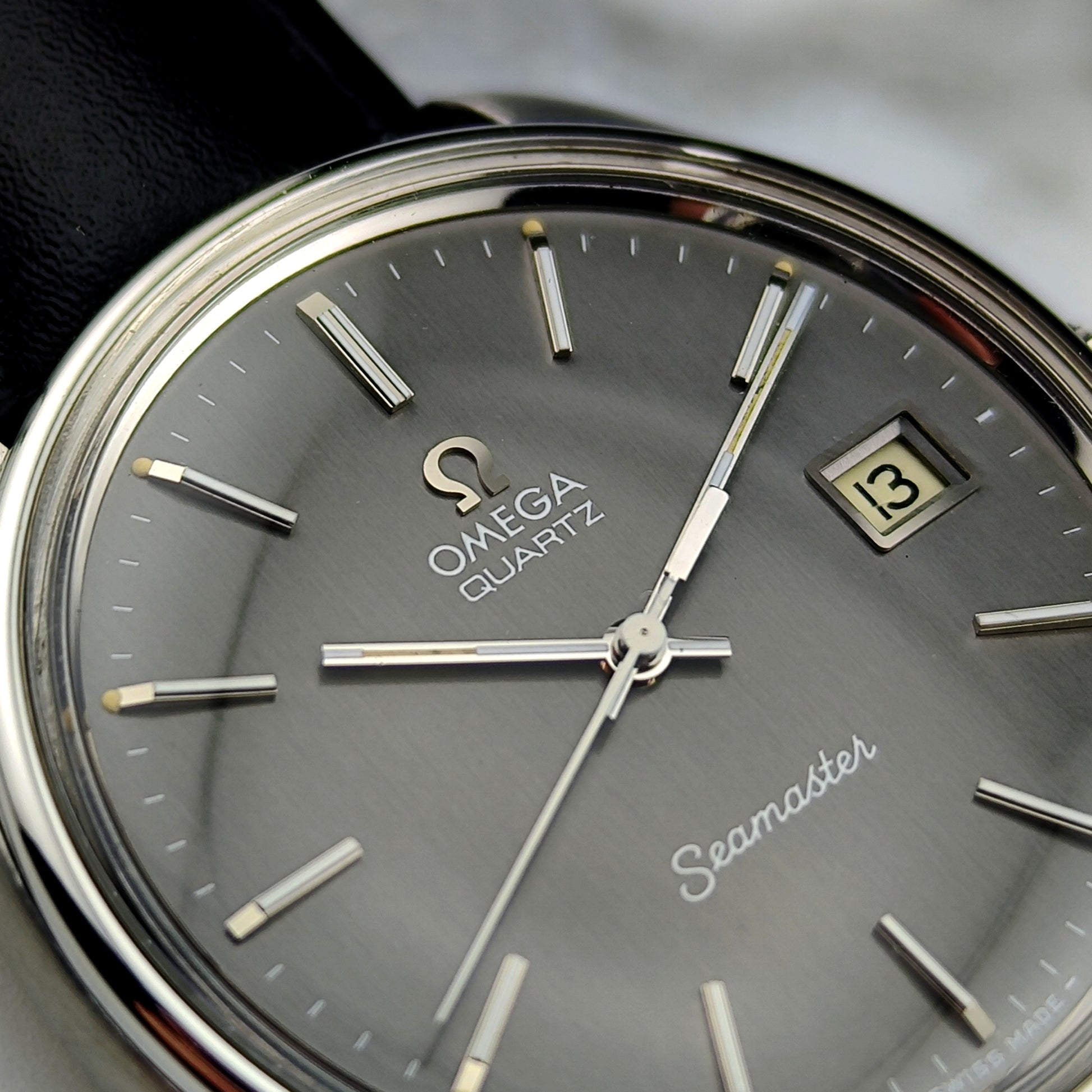 The Omega Seamaster Quartz with grey dial and original signed Omega crystal from 1976 (Ref. 196.0076). The watch is in fantastic condition; the movement has been inspected and tested. A beautiful timepiece featuring the iconic Omega C-shape design.