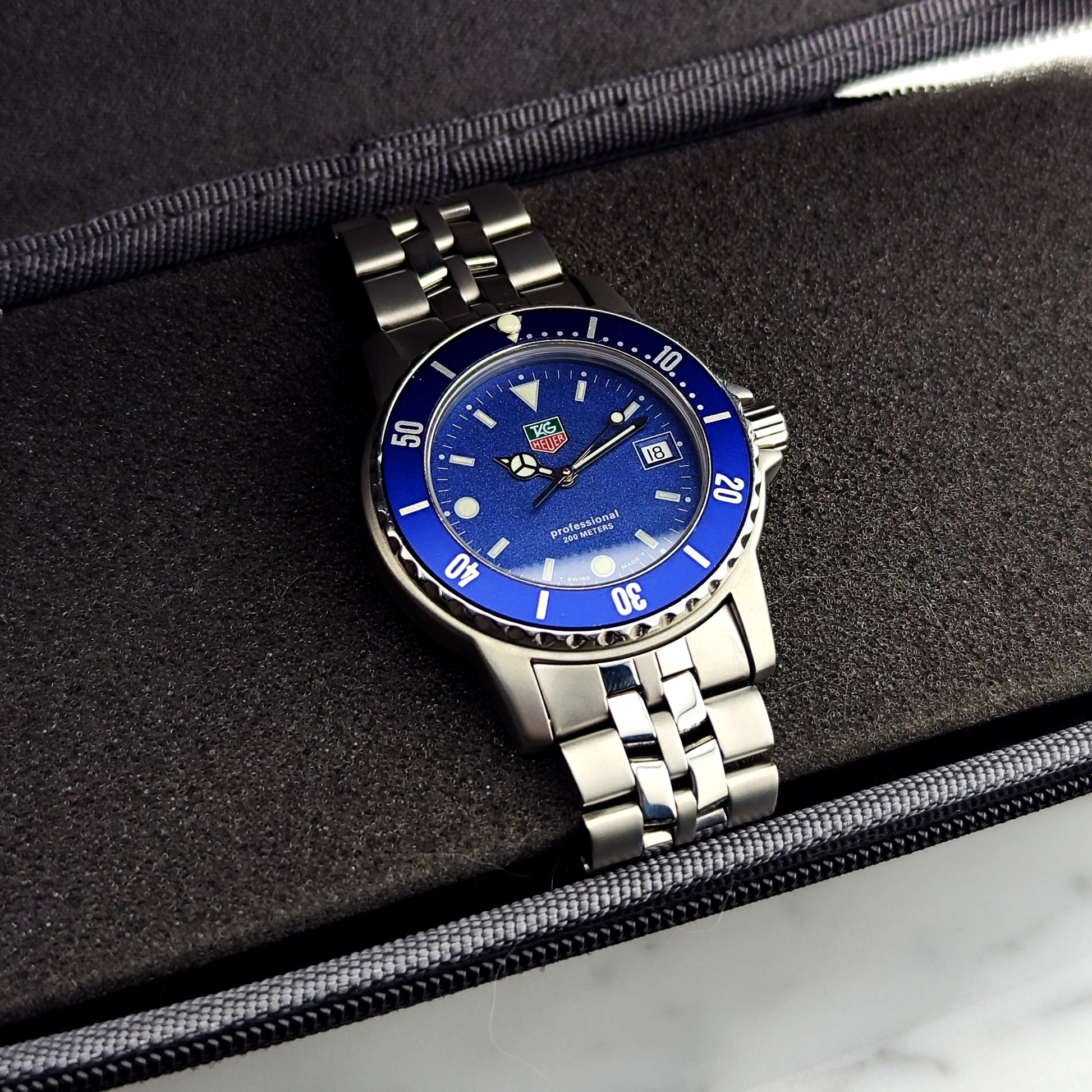 The TAG Heuer Professional 1500 in the rare blue version [Ref. WD1214]. This watch is in fantastic condition. We have tested the water resistance to 6 bar, and the movement has also been checked and tested. A fantastic watch for you. Act quickly - this model is rarely seen and tends to sell fast.