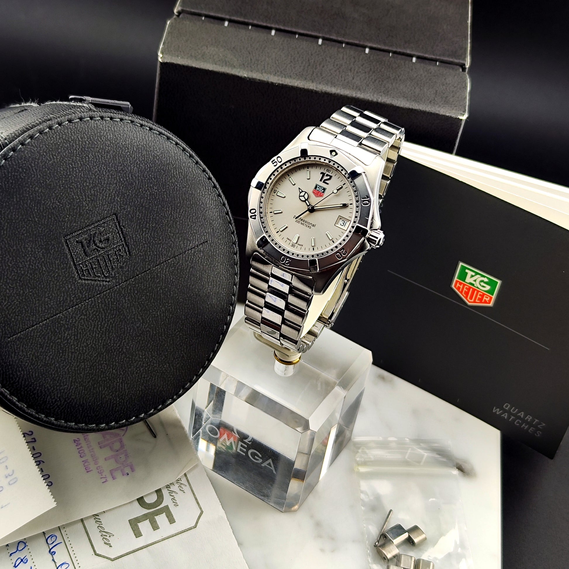 The TAG Heuer Professional 2000 Steel with box (Ref. WK1112-0) is a beautiful timepiece. It comes complete with the original box and the original invoice from 2002—an absolute dream for collectors. The instruction manual as well as additional bracelet links are also included.