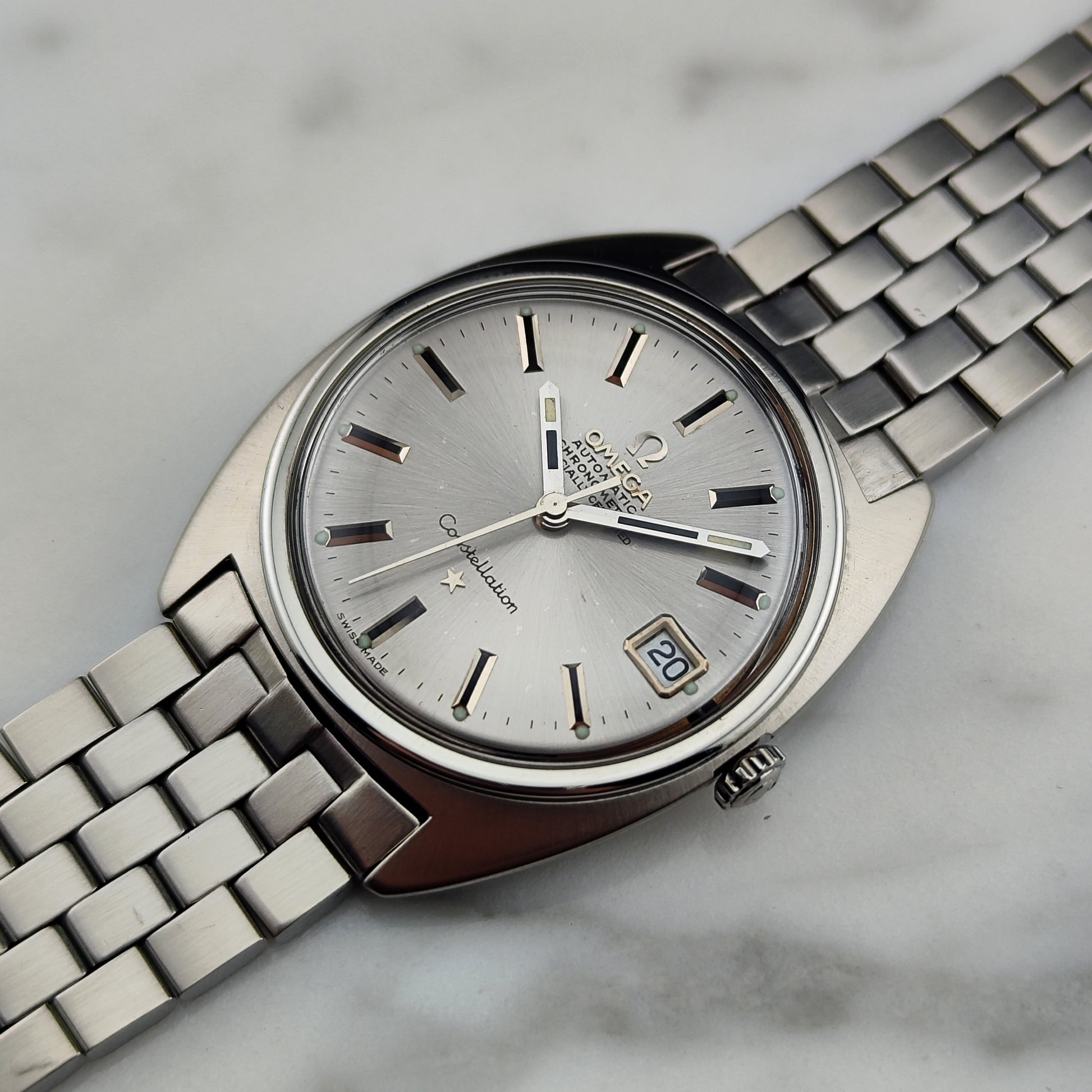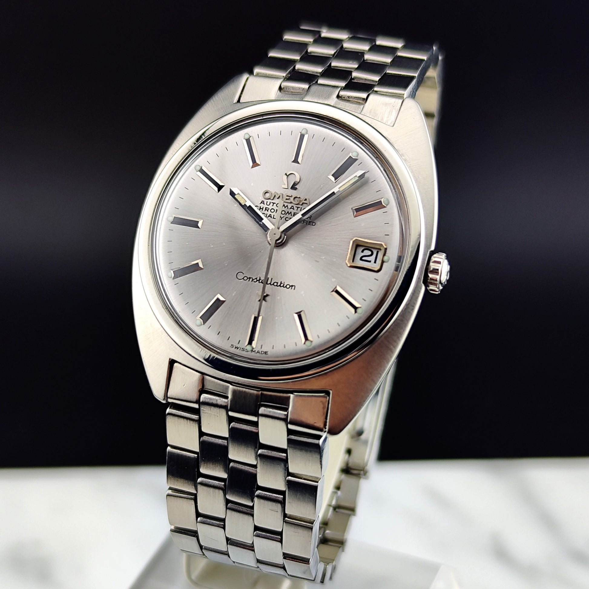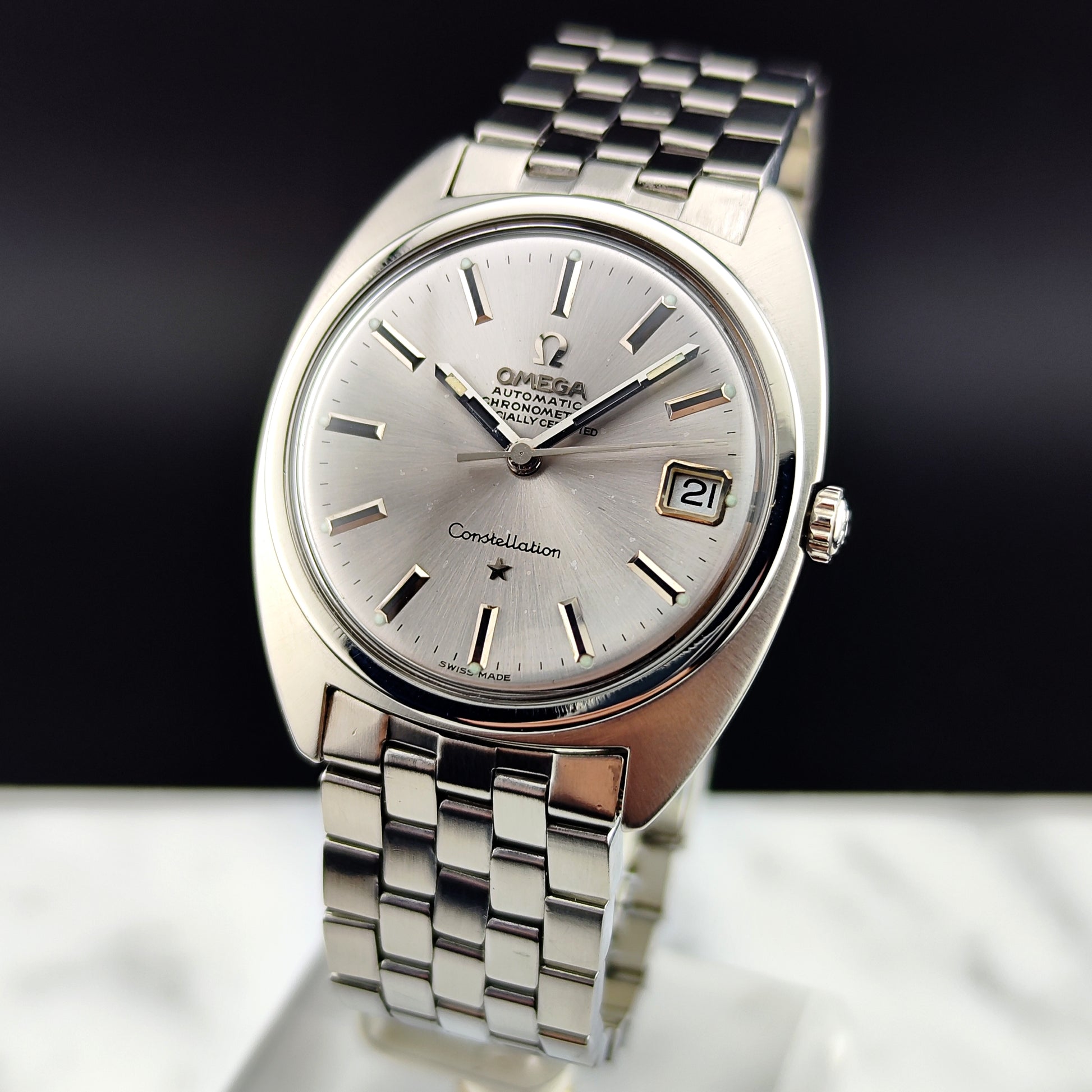 Omega Constellation C-Shape mit seltenem Stahlarmband (originales Omega-Armband) aus dem Jahr 1966 [Ref. 168.017]. Eine wunderschöne, zeitlose Uhr. Das Uhrwerk wurde geprüft. Eine hervorragende Wahl für Sie.