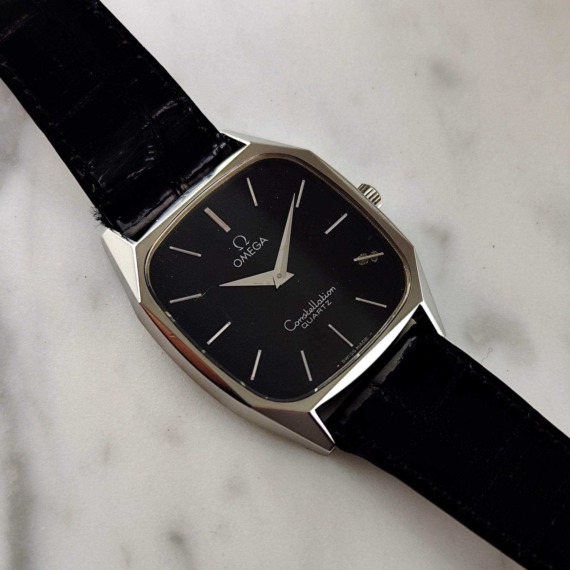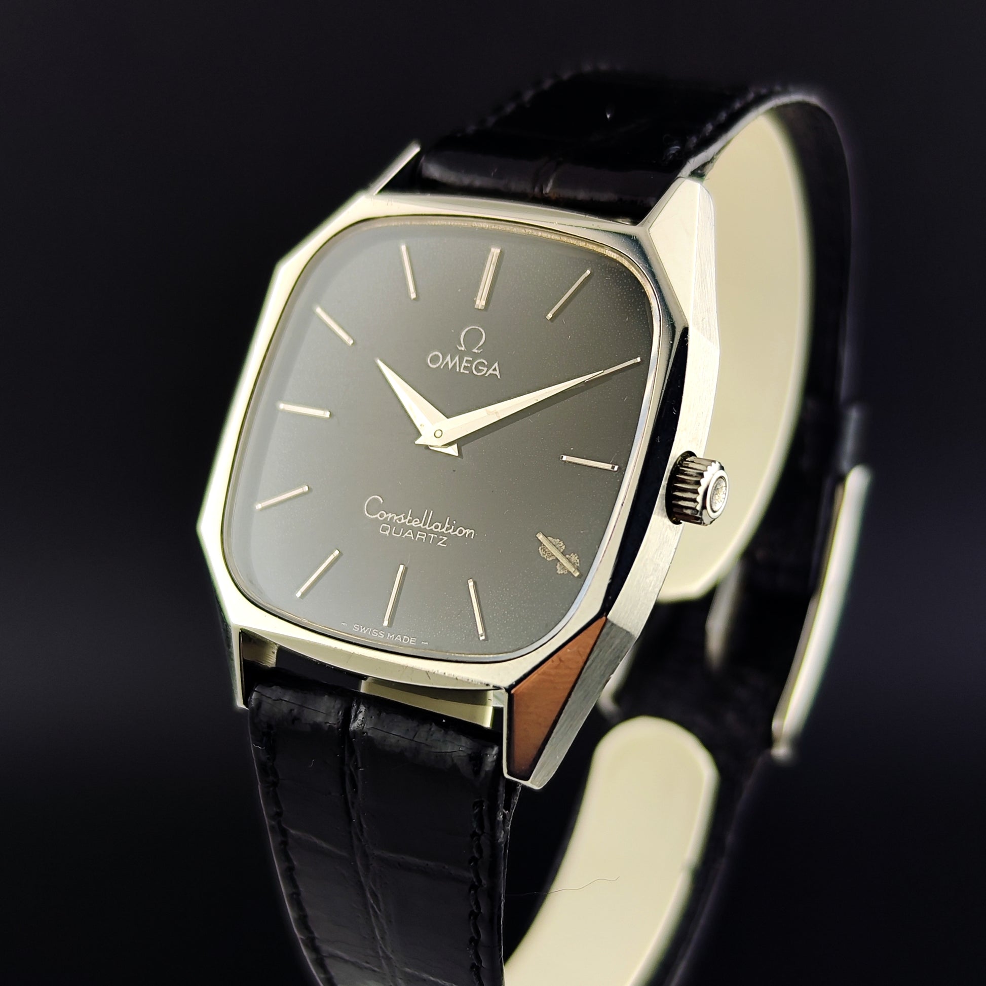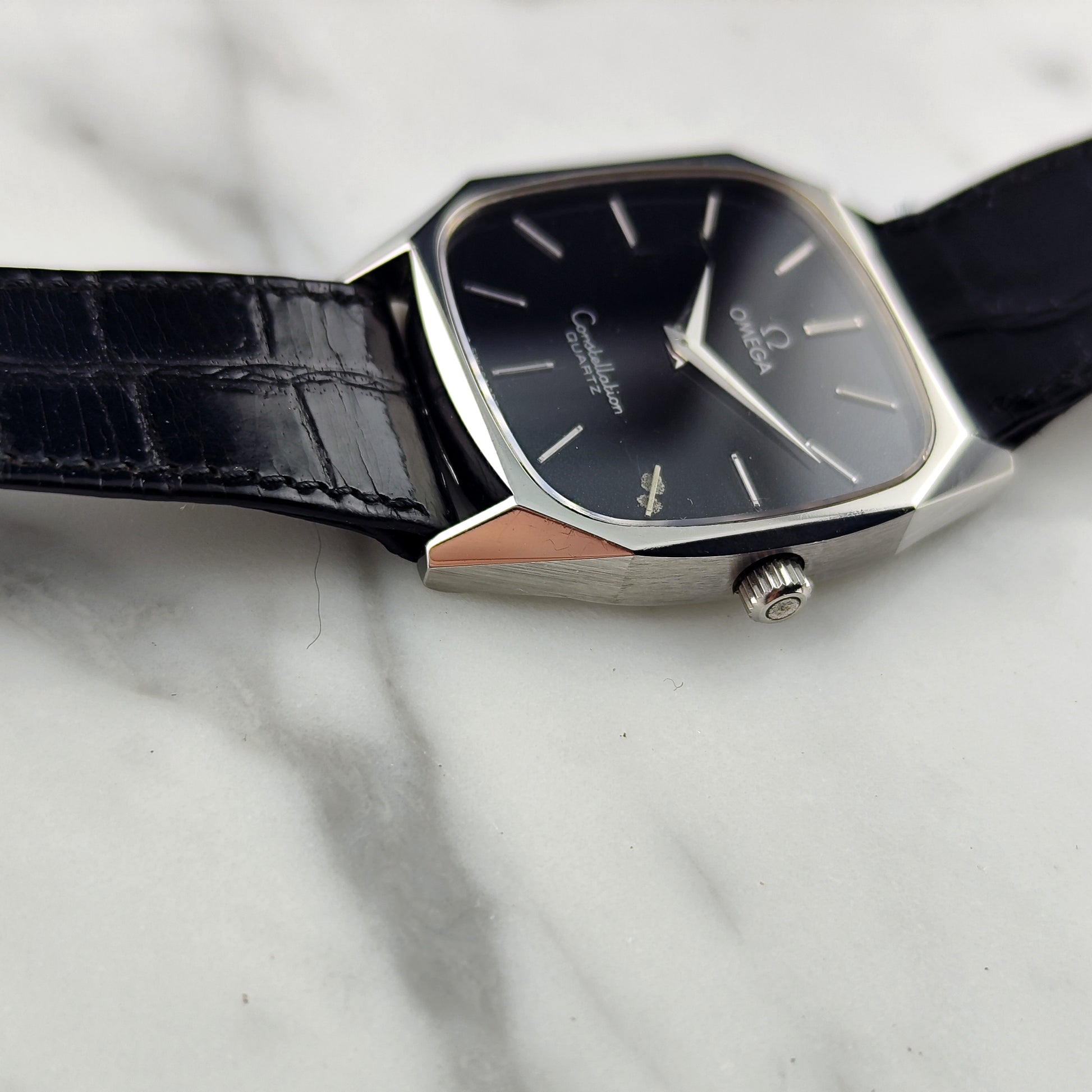 Die Omega Constellation Quartz mit schwarzem Zifferblatt [Ref. 191.0014] ist äußerst selten und schwer zu finden. Stand 8. März 2026 sind weltweit nur zwei Exemplare online gelistet. Das Zifferblatt weist eine gleichmäßige, schöne Patina auf; ein Index ist, wie auf den Bildern zu sehen, leicht korrodiert. Die Uhr verfügt über das originale Lederarmband und die originale Schließe. Alles an dieser Uhr ist original, sogar das Glas.
