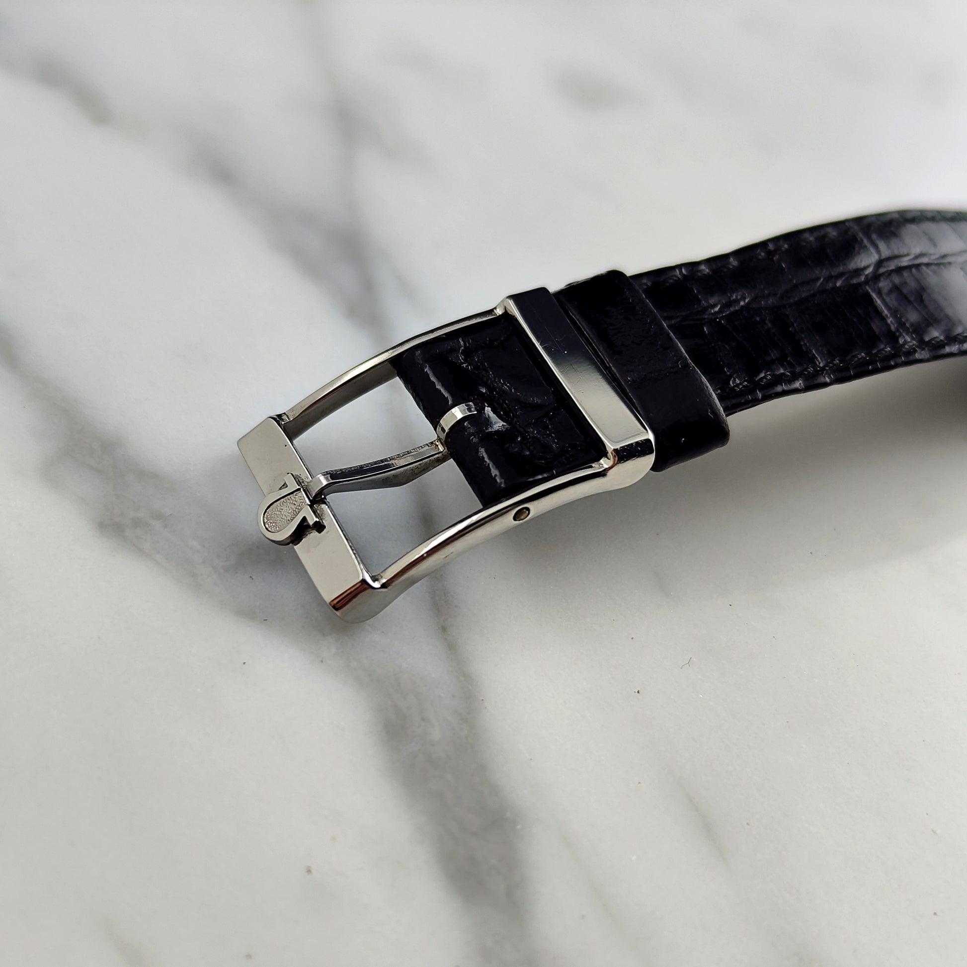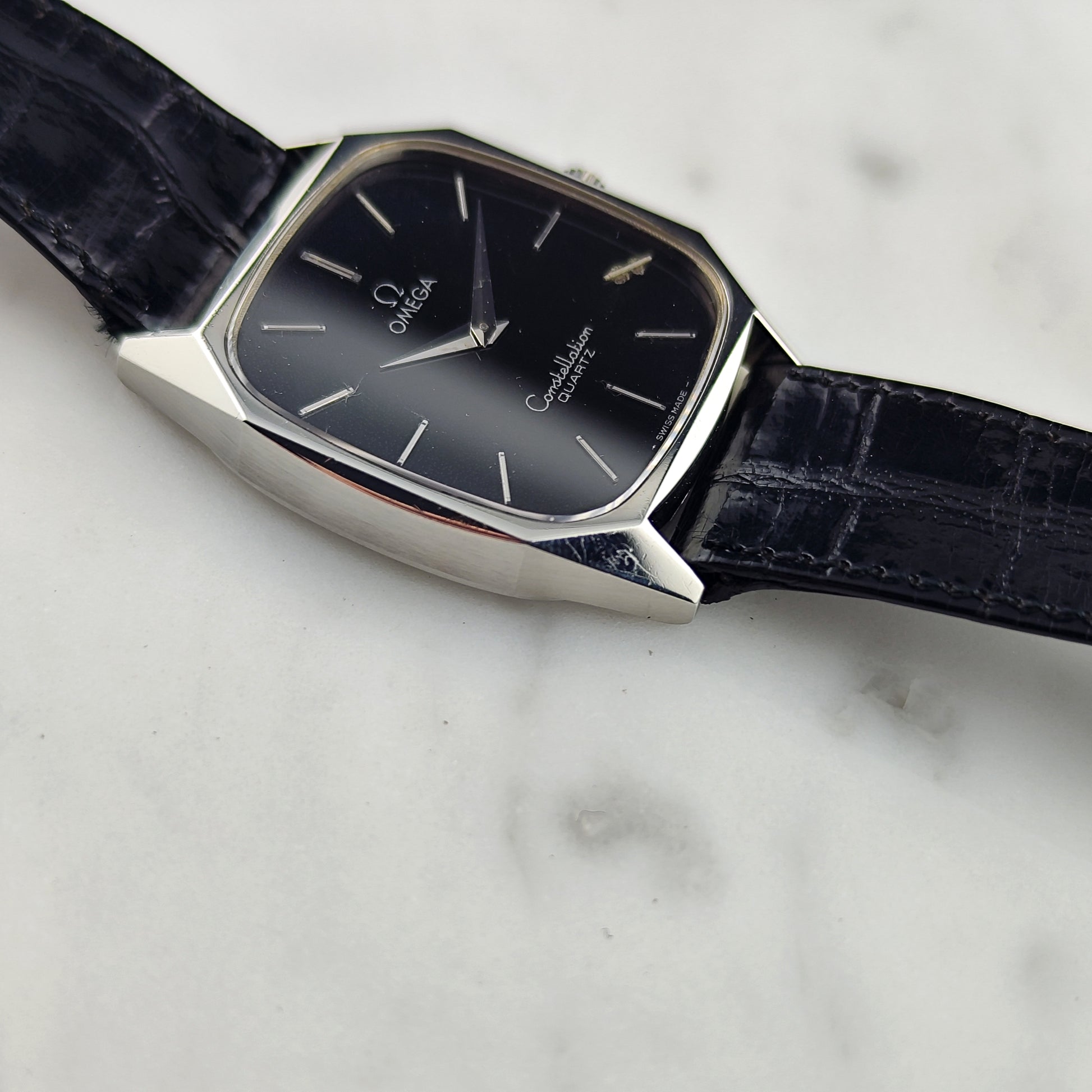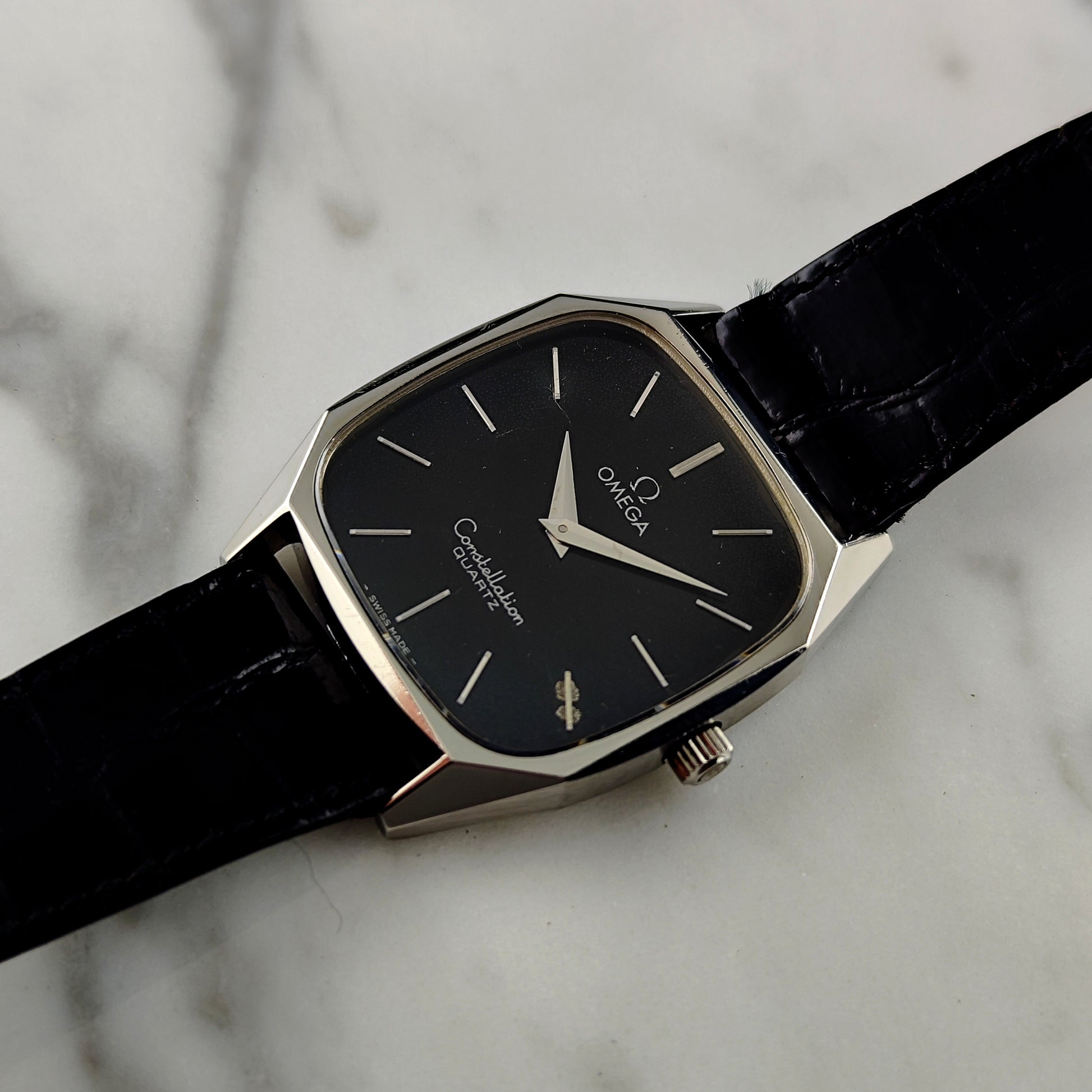 Die Omega Constellation Quartz mit schwarzem Zifferblatt [Ref. 191.0014] ist äußerst selten und schwer zu finden. Stand 8. März 2026 sind weltweit nur zwei Exemplare online gelistet. Das Zifferblatt weist eine gleichmäßige, schöne Patina auf; ein Index ist, wie auf den Bildern zu sehen, leicht korrodiert. Die Uhr verfügt über das originale Lederarmband und die originale Schließe. Alles an dieser Uhr ist original, sogar das Glas.