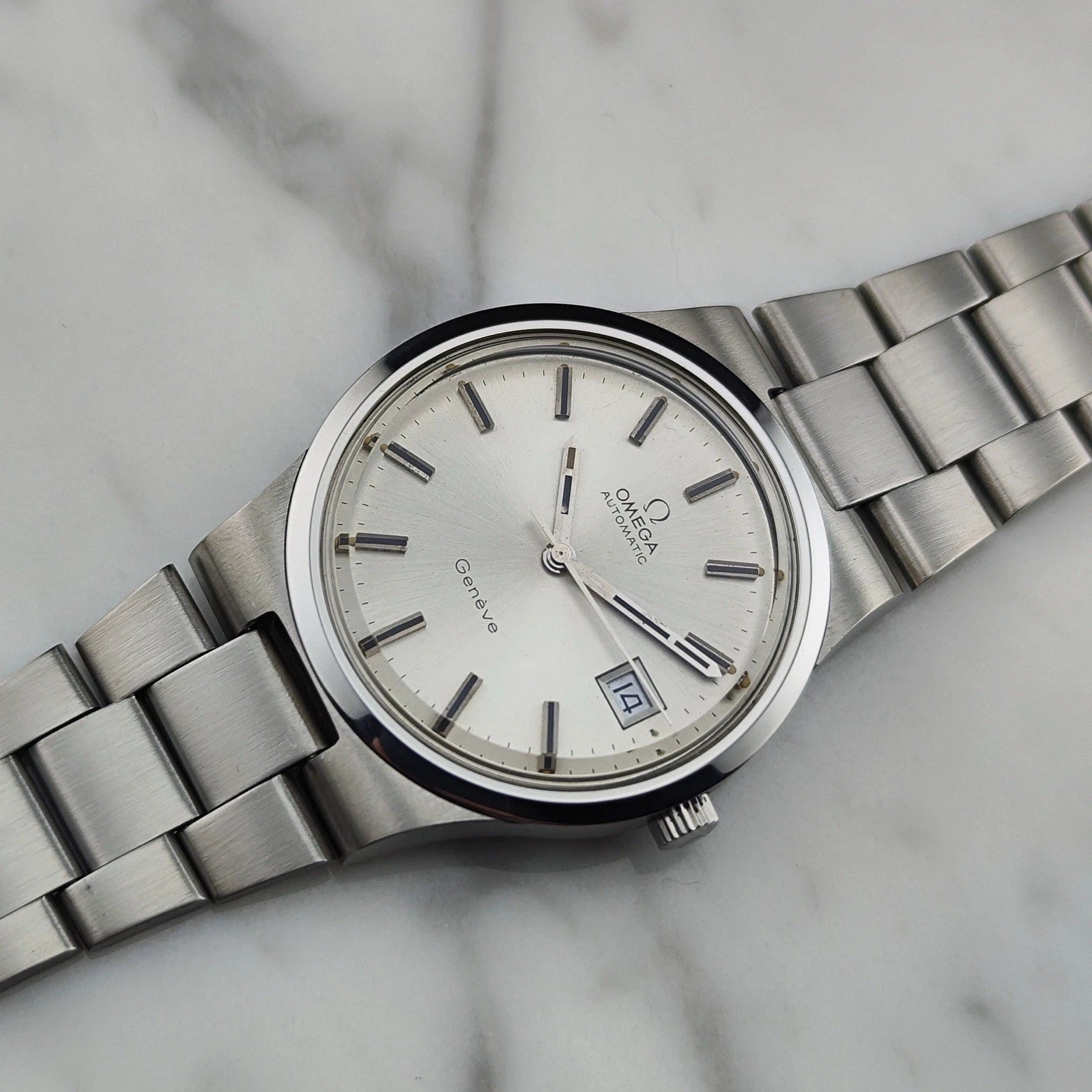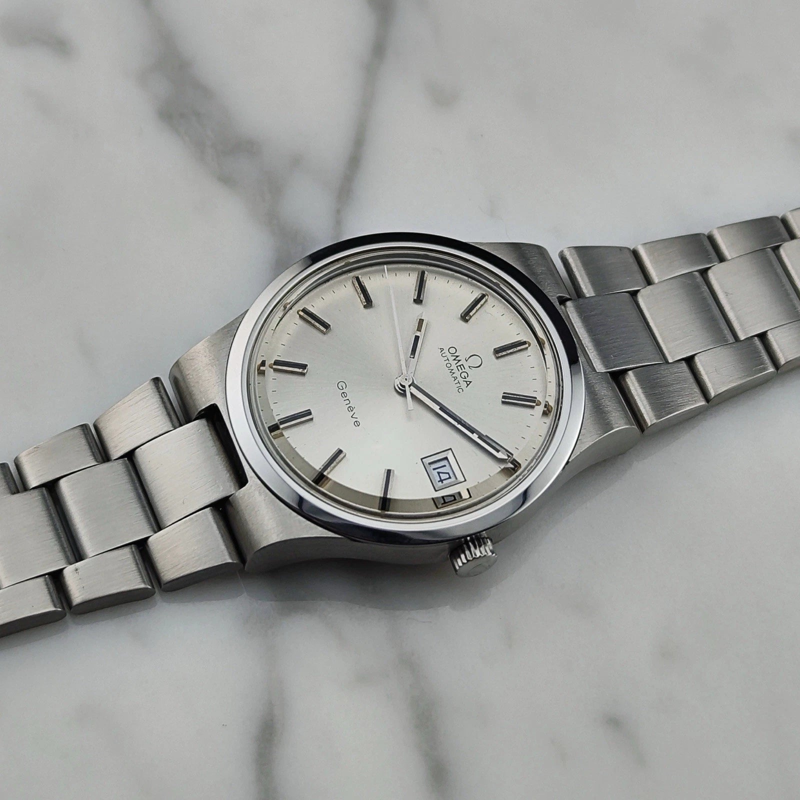 Die Omega Genève Automatic Date [REF. 166.0174] mit integriertem Stahlarmband. Sehr begehrt, extrem selten und verkauft sich sehr schnell. Um eine zu bekommen, muss man schnell handeln. Es gibt nur wenige auf dem Markt, aber viele, die sie haben möchten. Ausgestattet mit unglaublich präziser Ganggenauigkeit.
