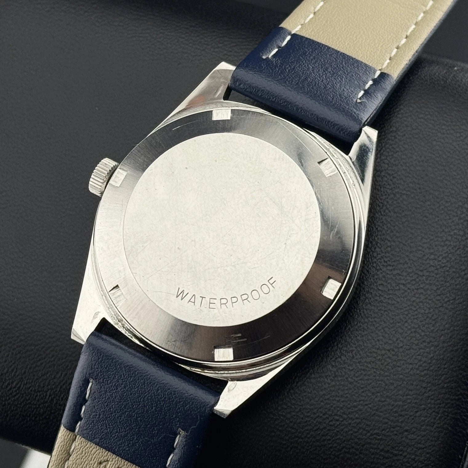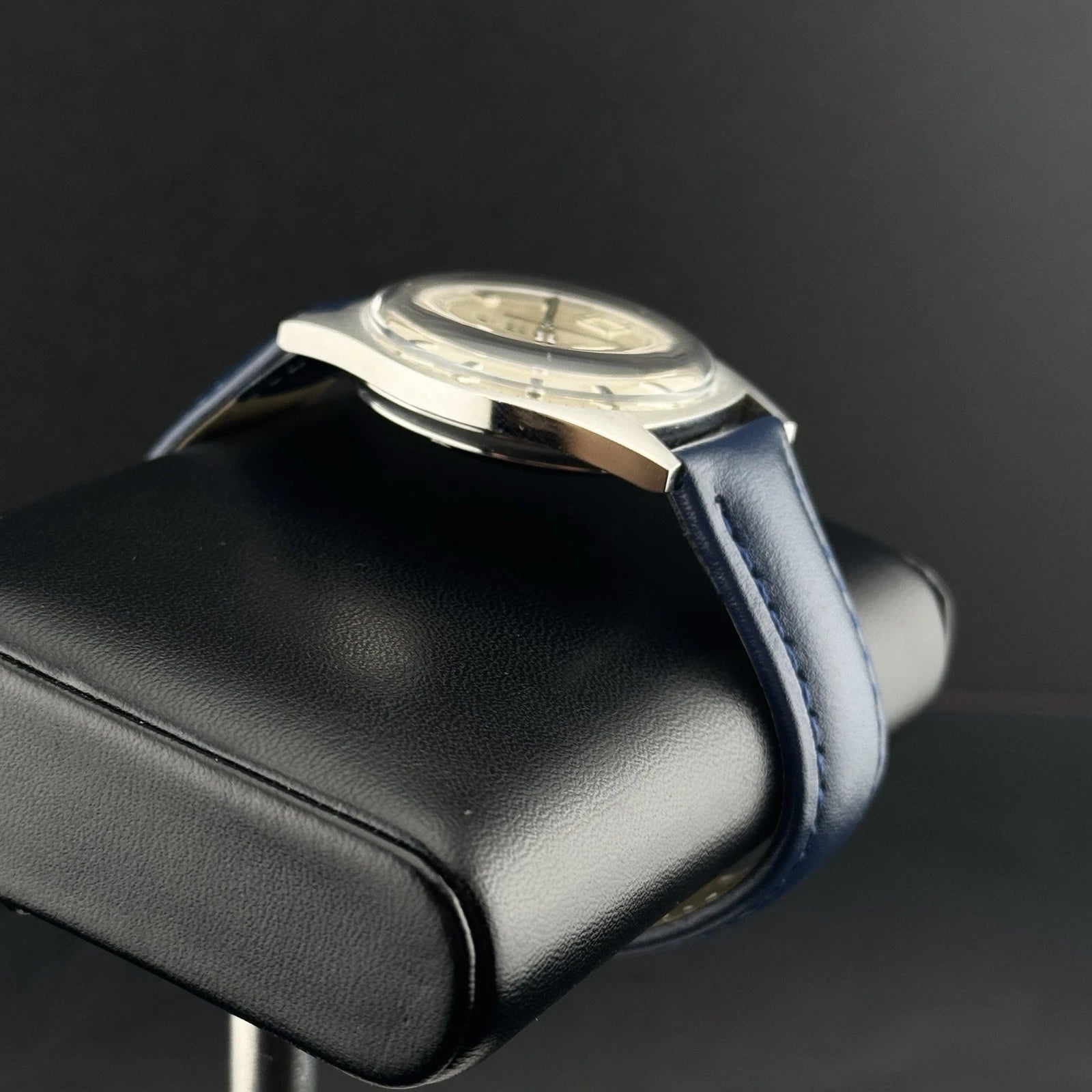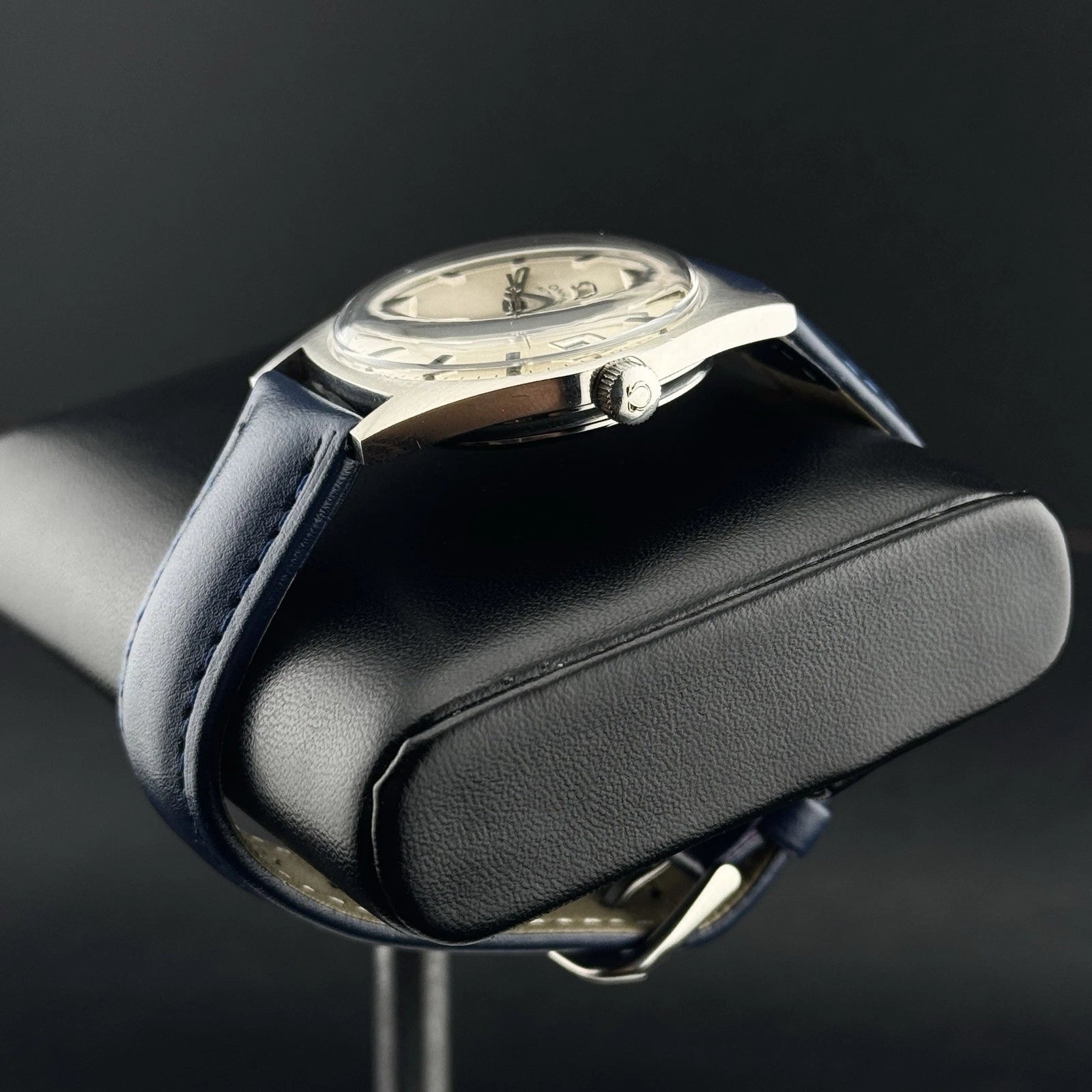 Die Omega Genève Automatic [Ref. 166.041] mit Stahlgehäuse und blauem Armband wird hier in nahezu neuwertigem Zustand präsentiert. Sie bietet ausgezeichnete Ganggenauigkeit und ist eine hervorragende Ergänzung für jede Sammlung. Ein echter Klassiker, gefertigt im Jahr 1969.