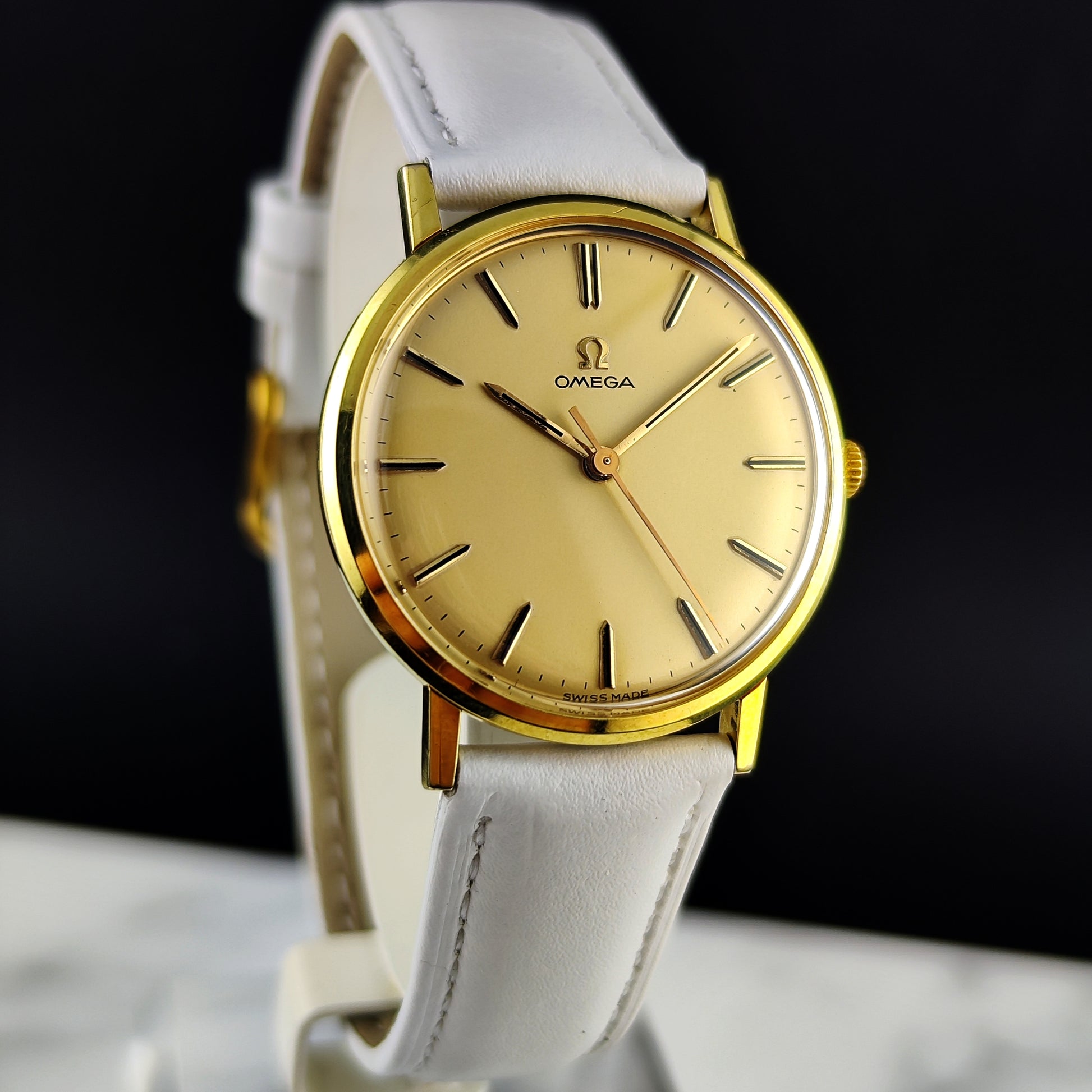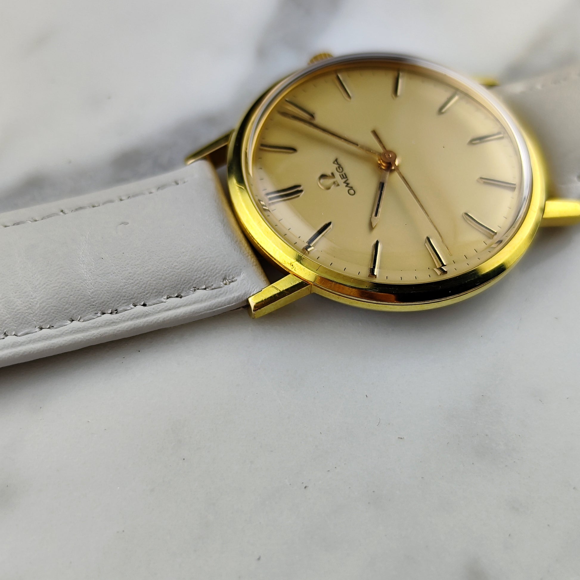 Omega Genève Classic Gold (1967) [Ref. 131.00019]. Die Uhr wurde im März 2026 von uns revidiert und befindet sich in einem sehr guten Zustand. Das Uhrwerk wurde geprüft und getestet. Ein wunderschöner Vintage-Zeitmesser von Omega – greifen Sie zu!