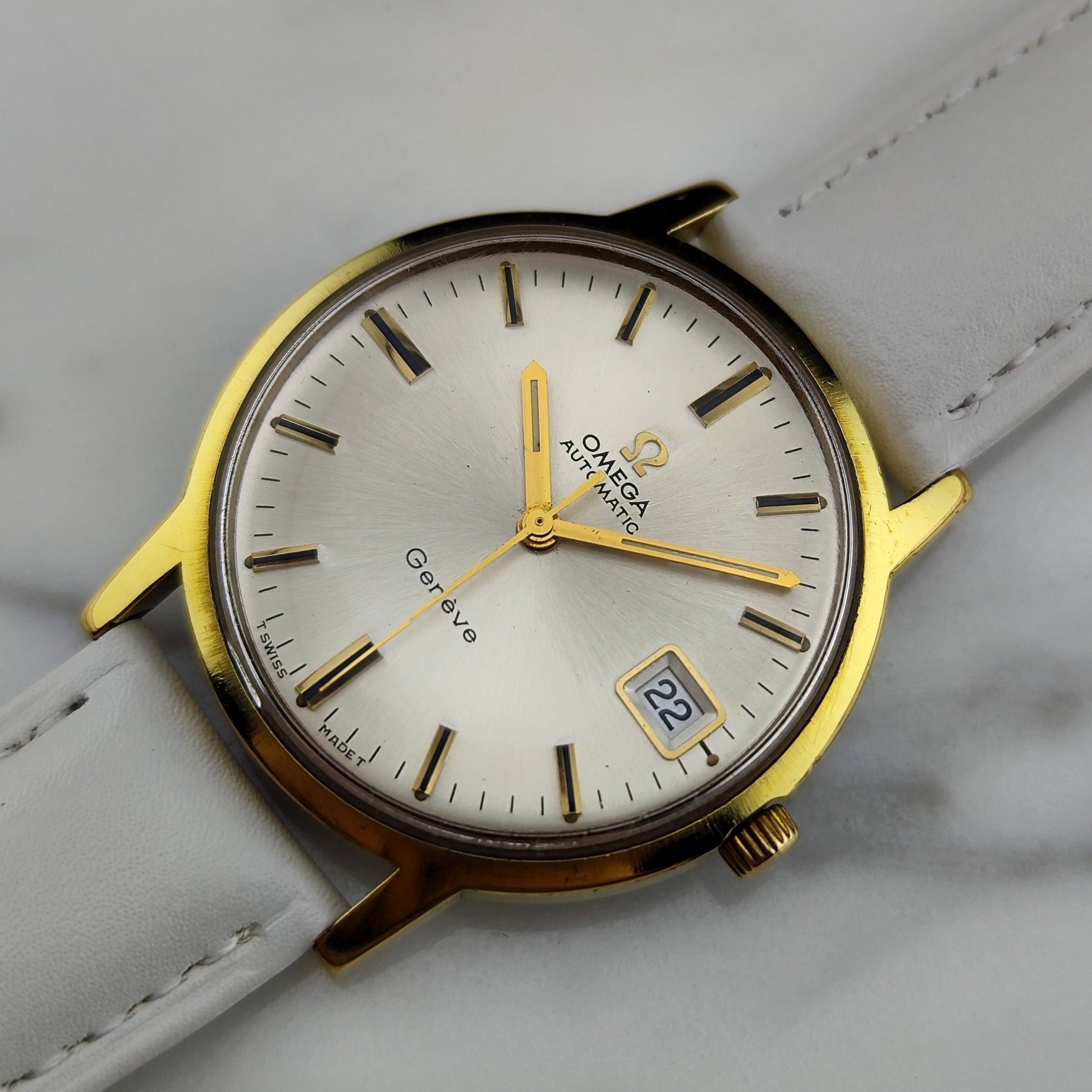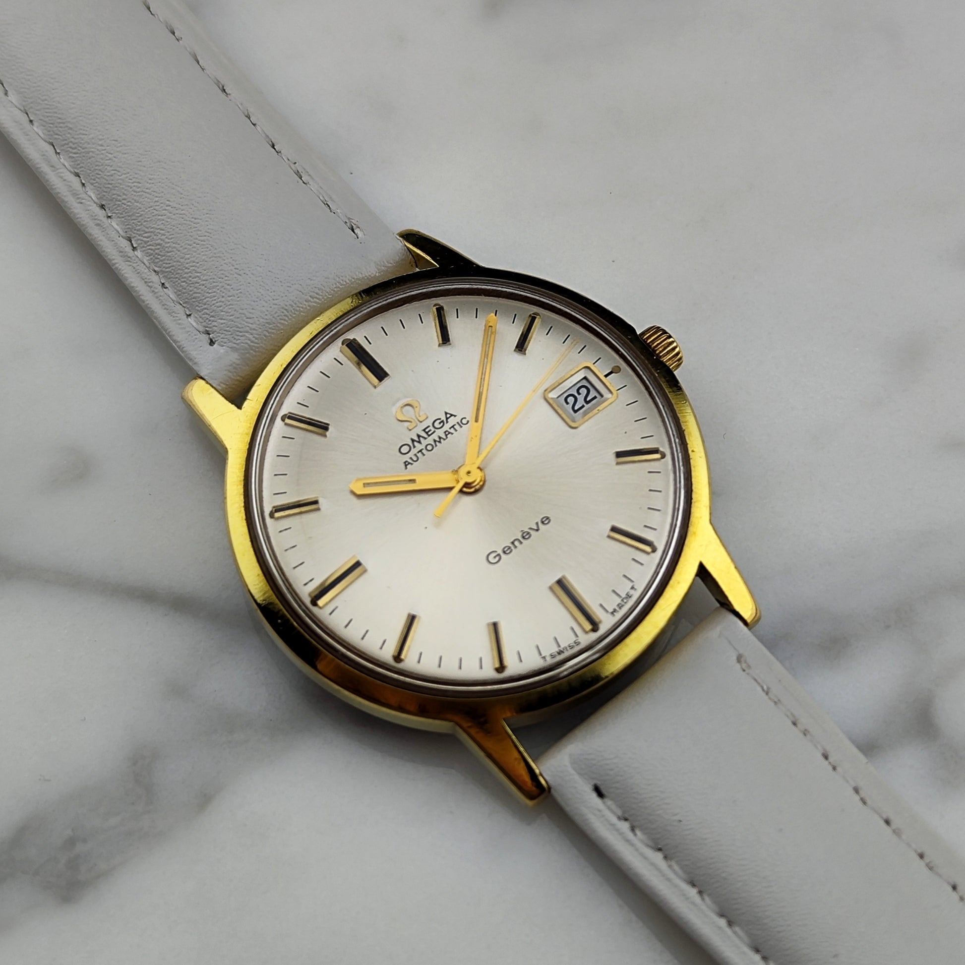 Die Omega Genève Gold White Dial im echten Miami-Stil [Ref. 166.070]. Mit ihrem weißen Lederarmband und dem unverkennbaren 80er-Jahre-Flair fängt diese Uhr den Zeitgeist perfekt ein. Selbstverständlich können wir sie auf Wunsch auch mit einem braunen oder schwarzen Armband liefern, aber uns persönlich gefällt sie so, wie sie hier ist, am besten. Stellen Sie sich vor, Sie tragen diese Uhr, während Sie in einem weißen Testarossa cruisen – das ist echtes Flair.