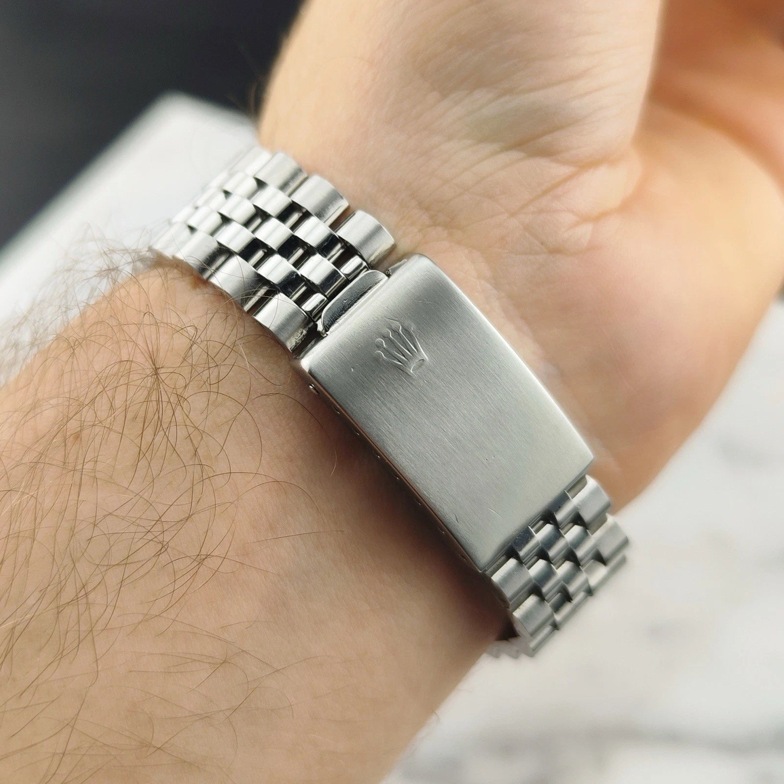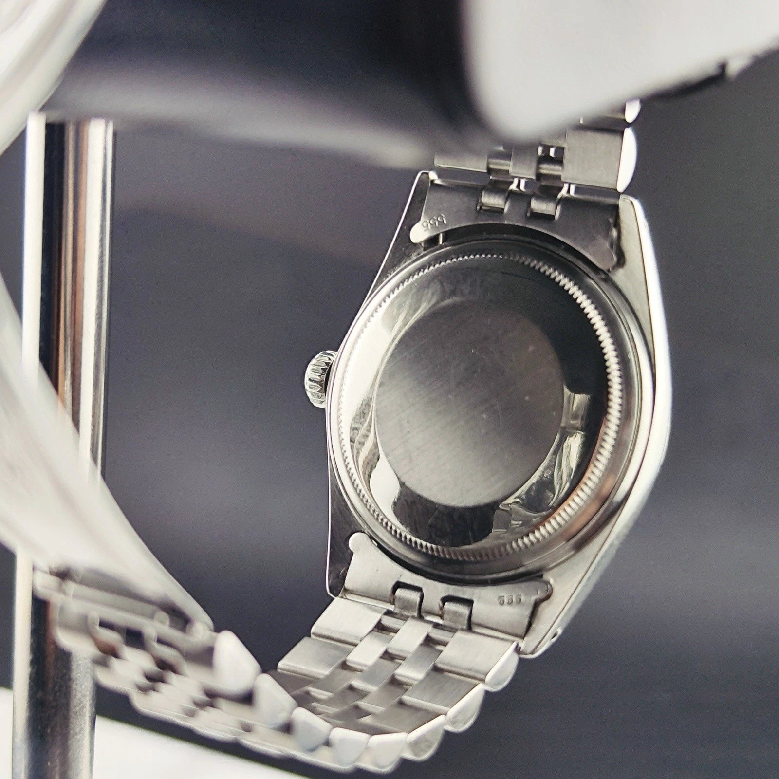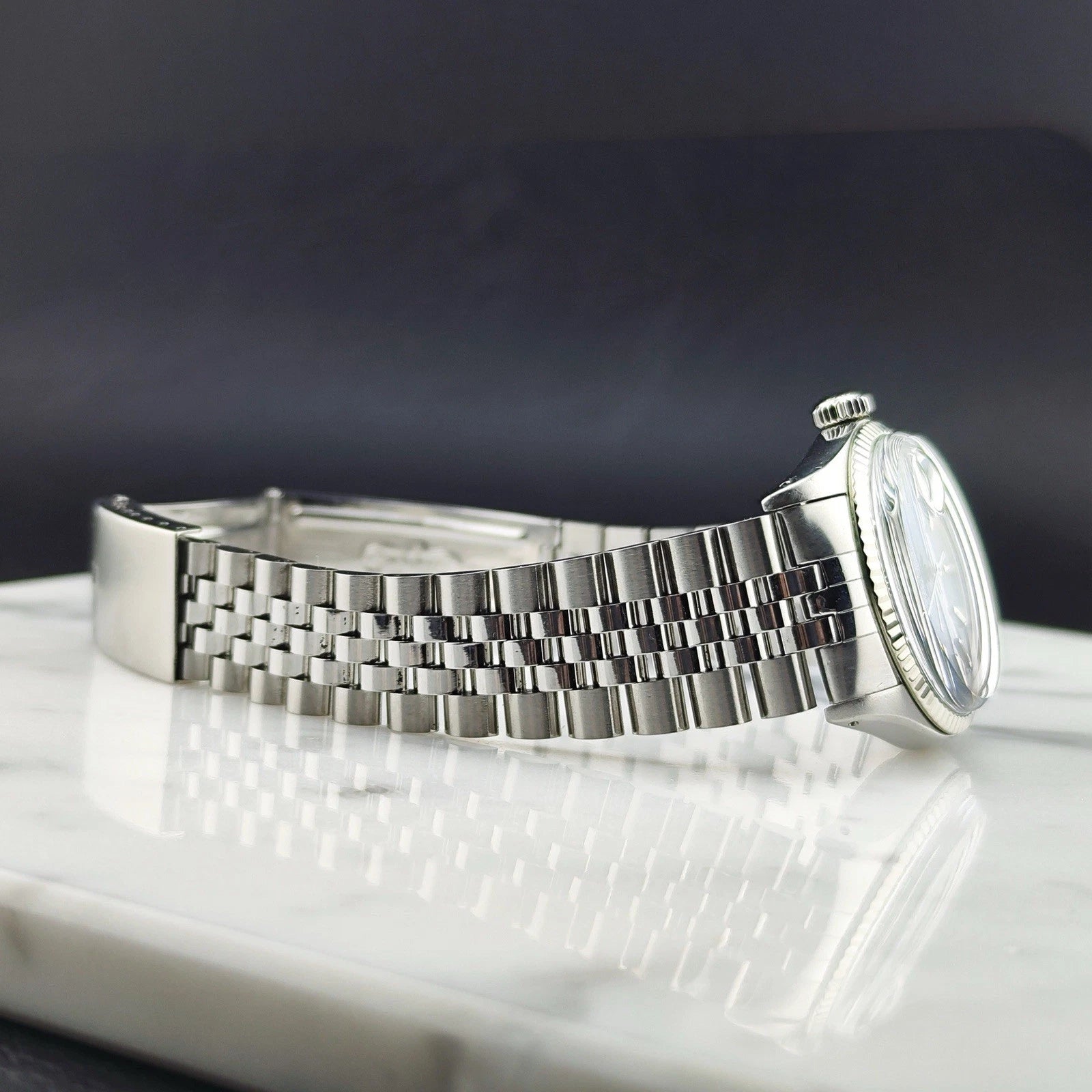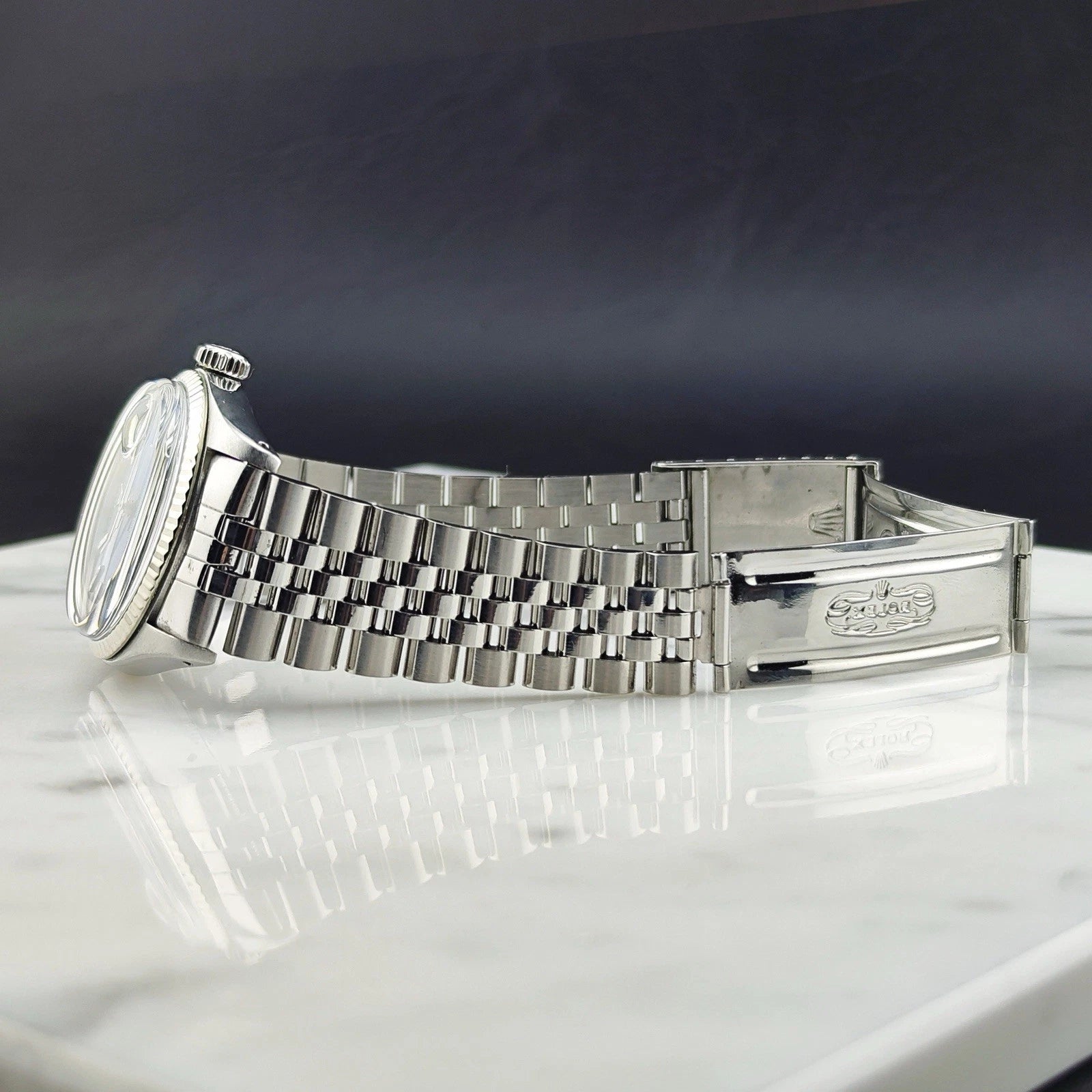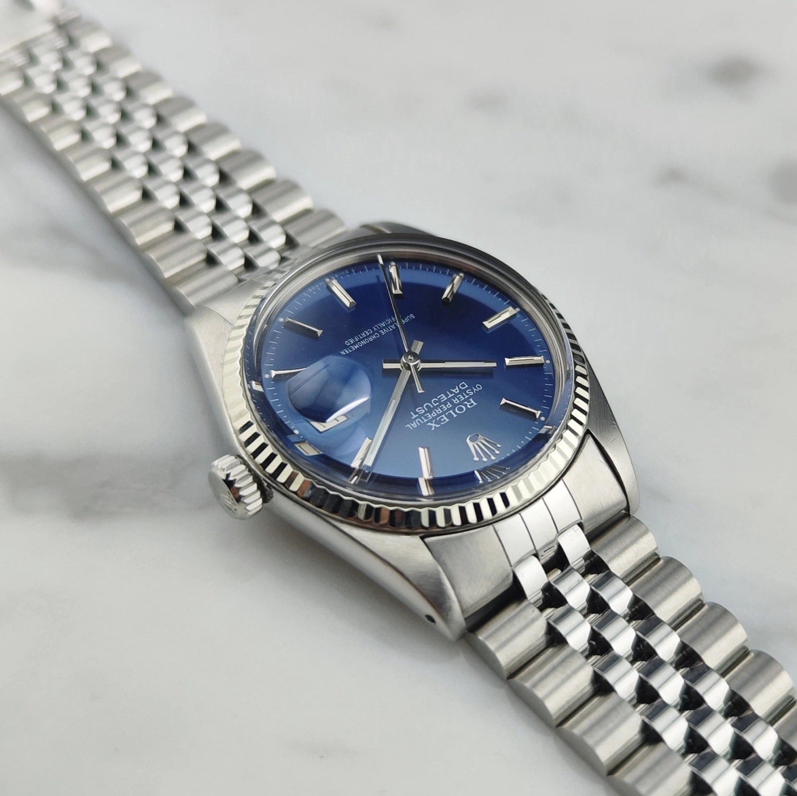 Rolex Datejust 36 Ref. 16014 — mit einer 18ct Weißgold-Lünette und dem sehr begehrten, seltenen blauen Zifferblatt. Ein absoluter Juwel unter den Zeitmessern, mit hervorragender Ganggenauigkeit und minimaler Dehnung des Armbands. Die Originalbox ist enthalten, und selbstverständlich stellen wir unser eigenes Echtheitszertifikat aus.